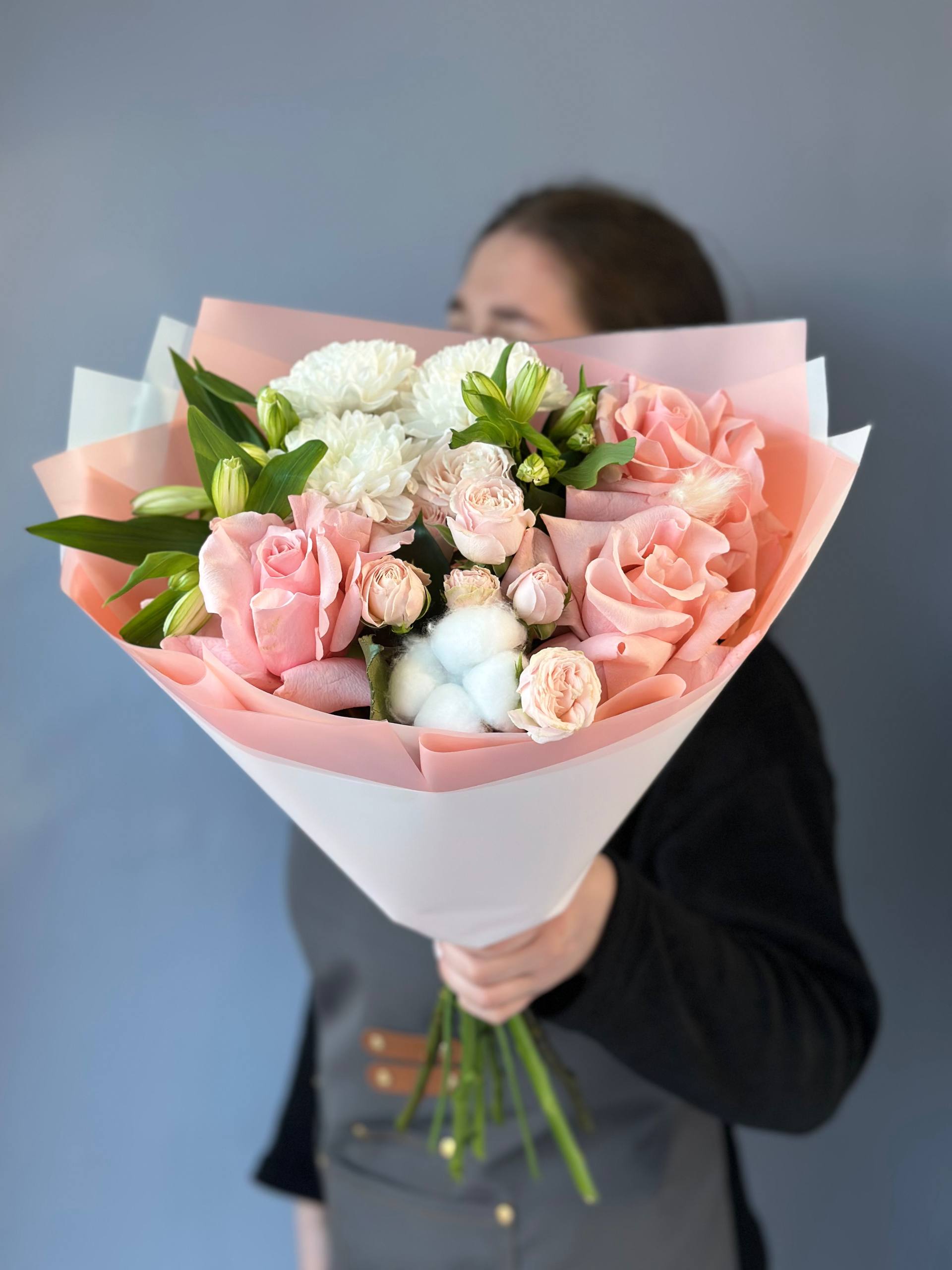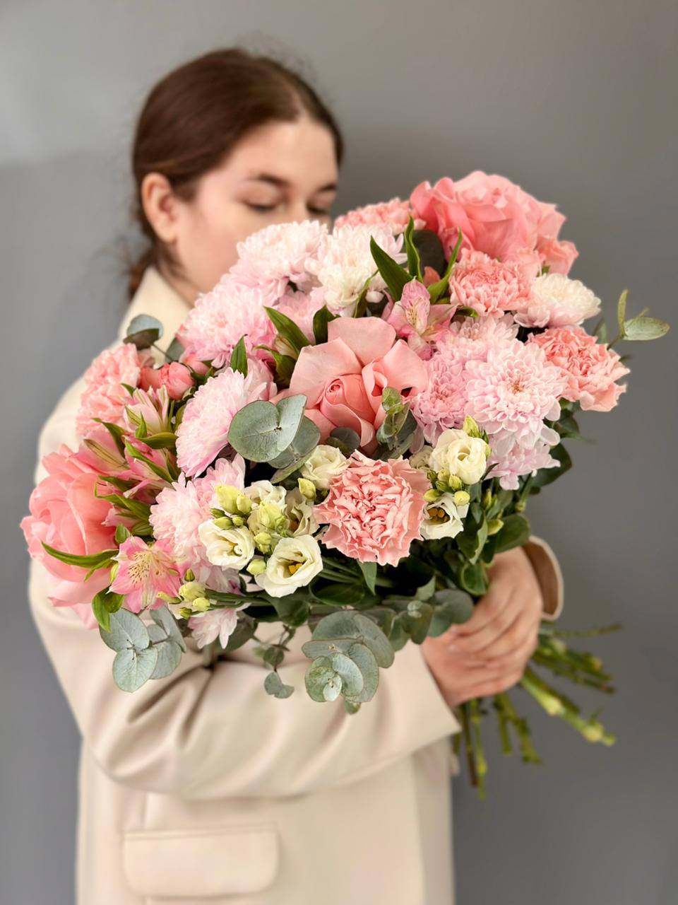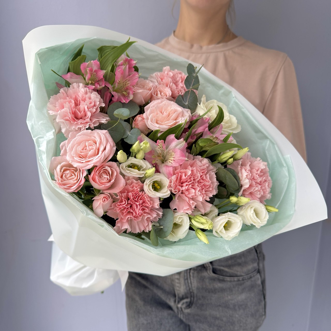 Розы в теплых розовых тонах, гвоздики, кустовые розы и белая эустома собраны в мягкую, женственную композицию с живой зеленью. Букет выглядит объёмным, но остаётся очень деликатным — таким легко сказать спасибо или подарить заботу близкому человеку. Светлая упаковка поддерживает ощущение чистоты и внимания к детали.