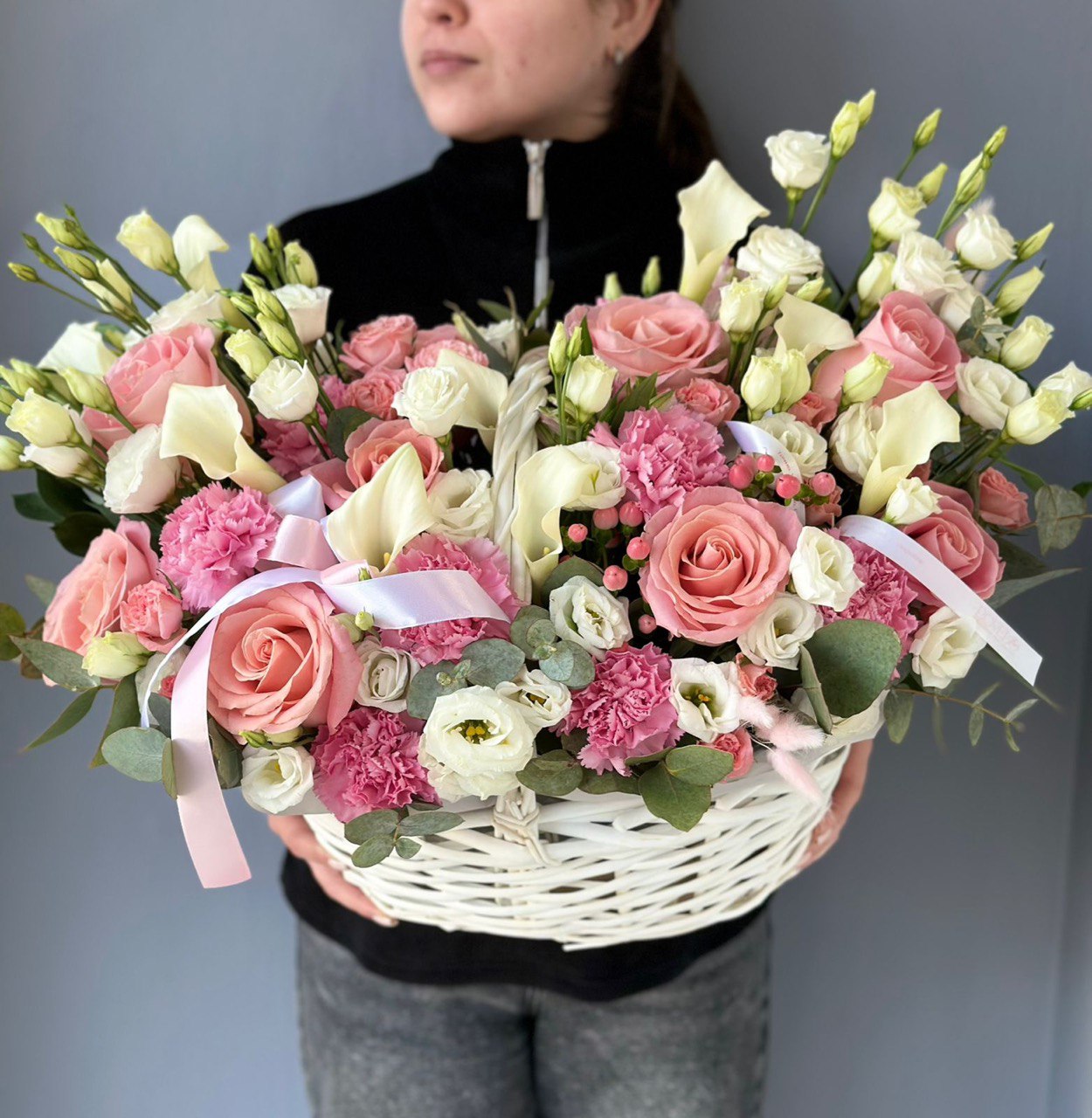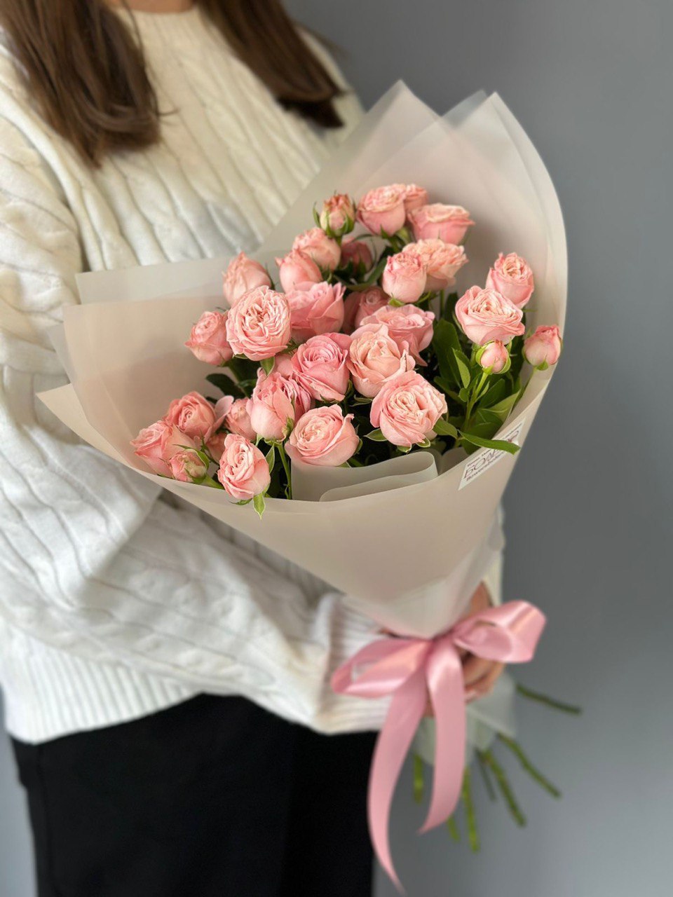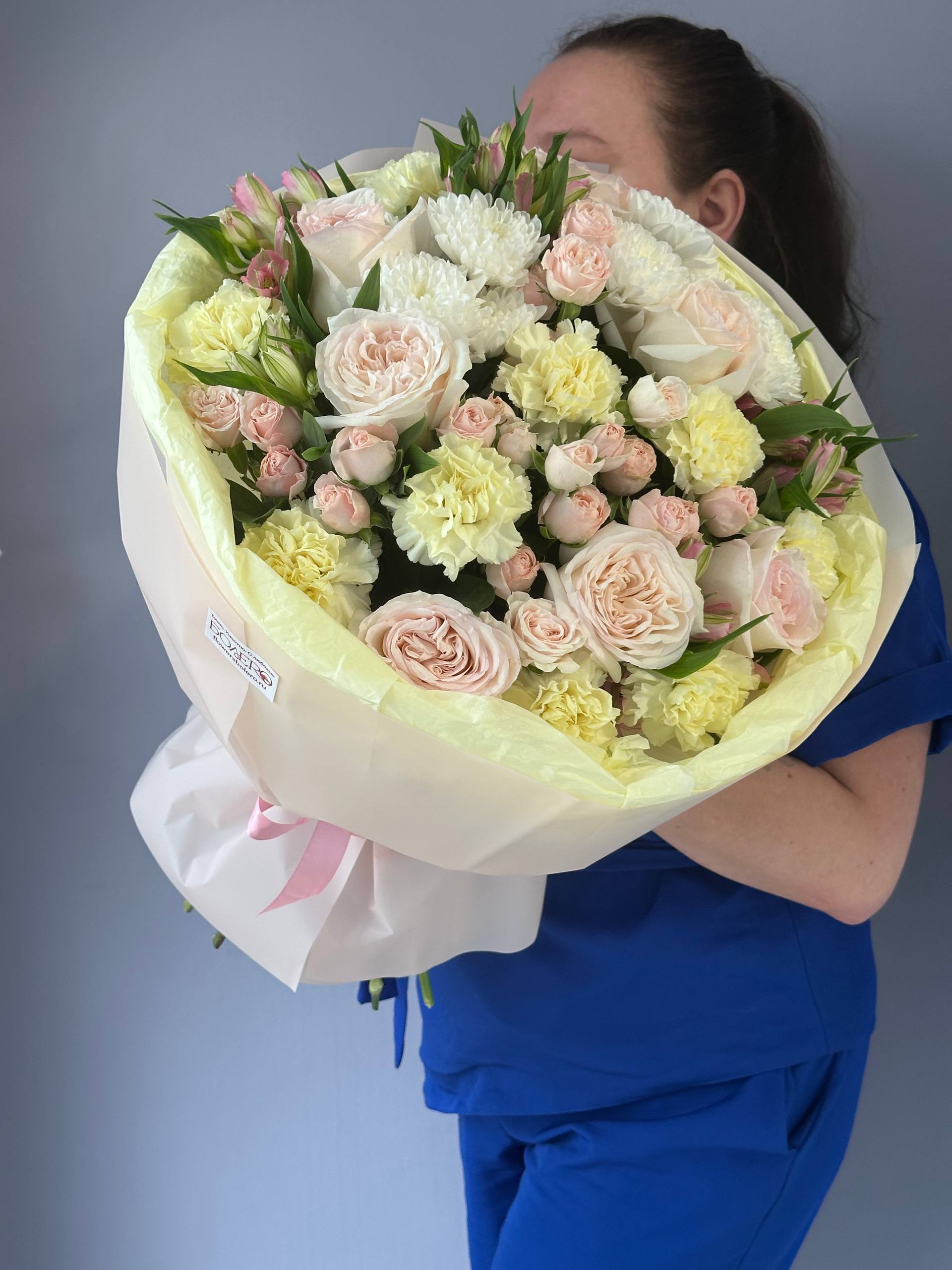Розы в теплых розовых тонах, гвоздики, кустовые розы и белая эустома собраны в мягкую, женственную композицию с живой зеленью. Букет выглядит объёмным, но остаётся очень деликатным — таким легко сказать спасибо или подарить заботу близкому человеку. Светлая упаковка поддерживает ощущение чистоты и внимания к детали.