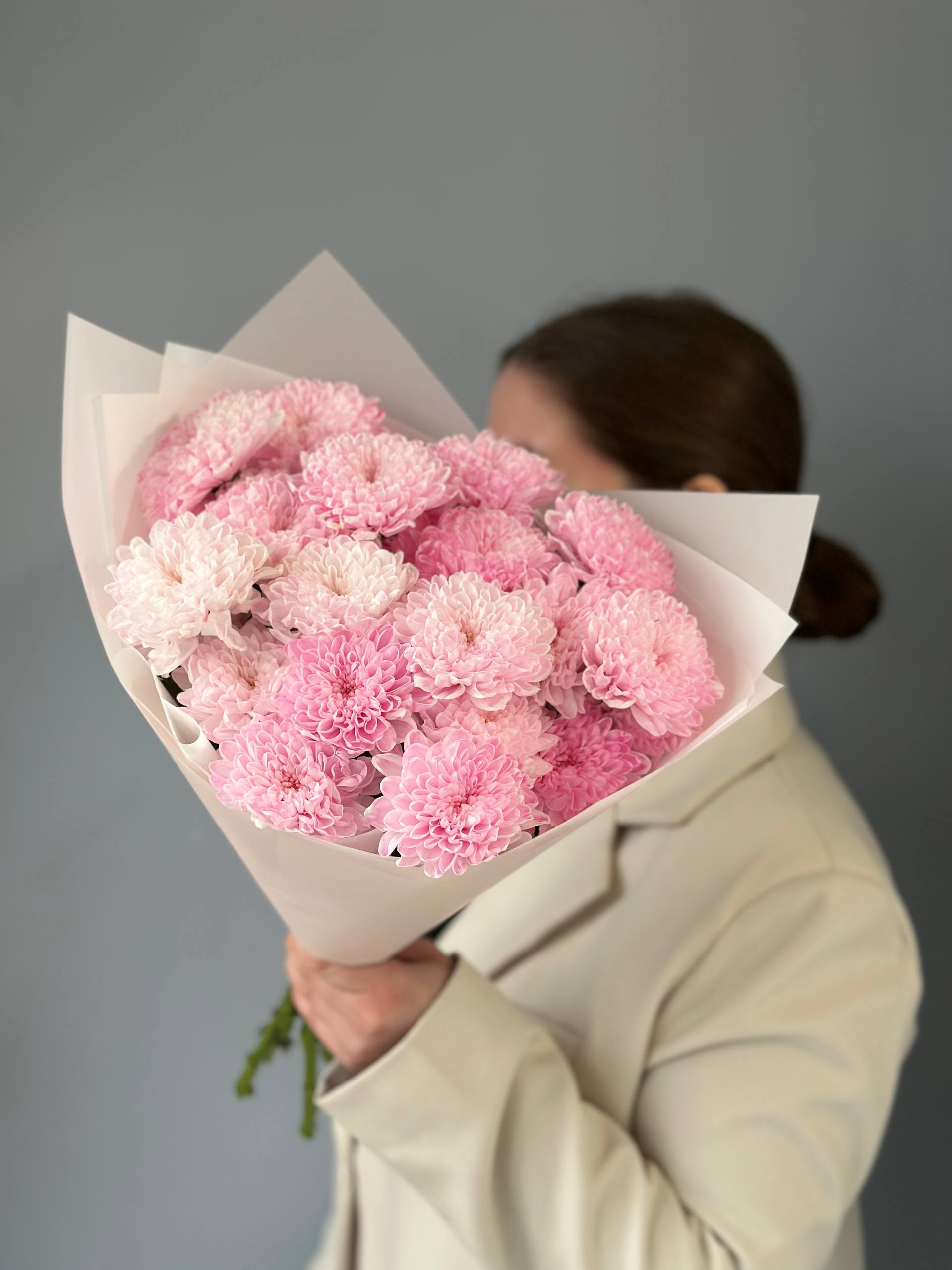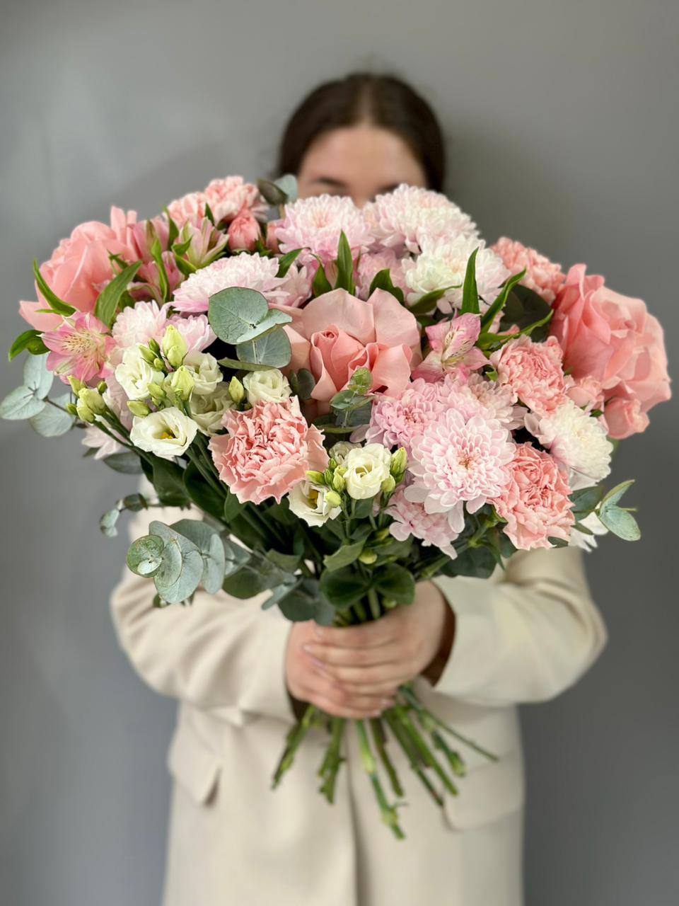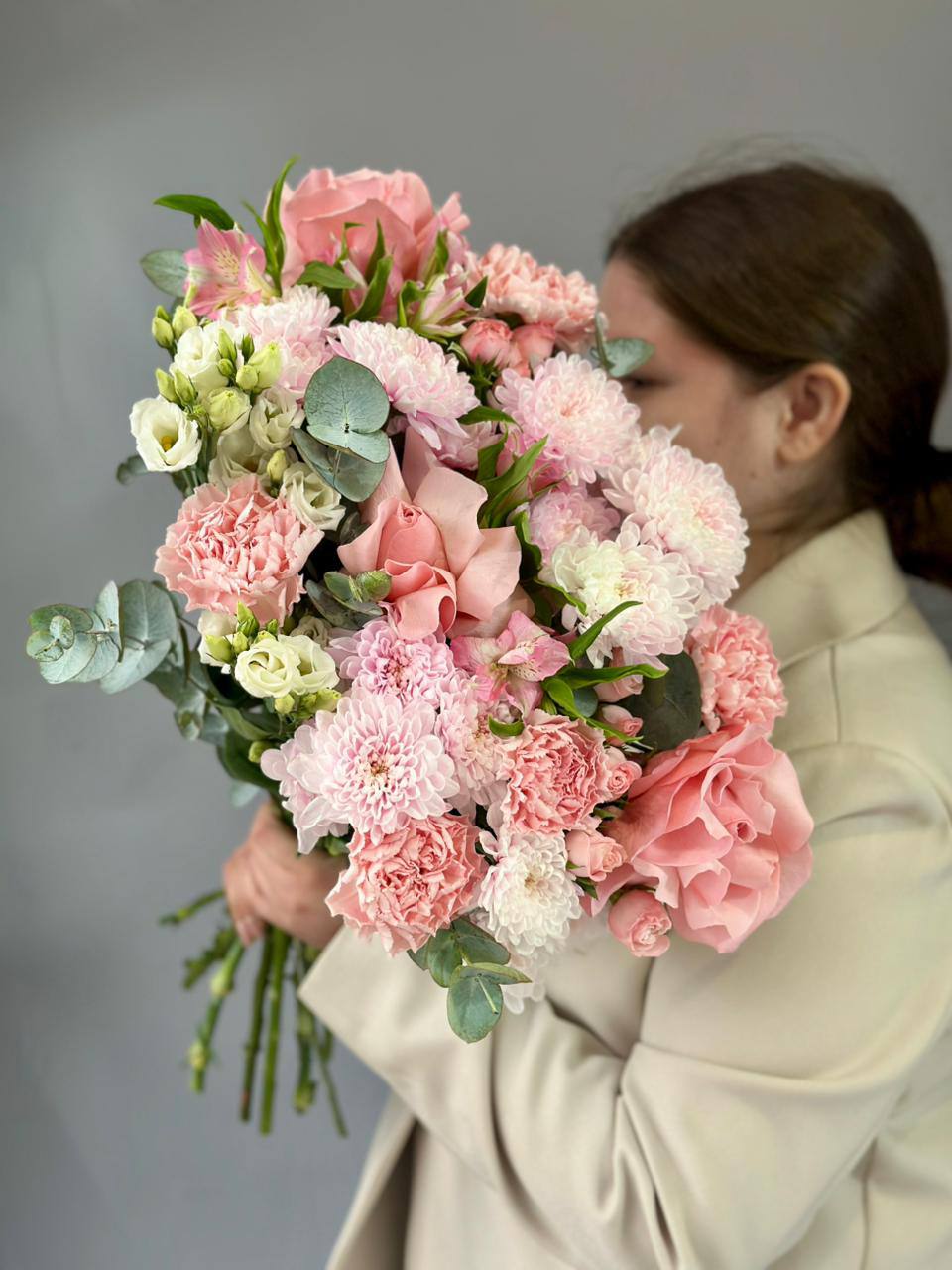 Крупные белые хризантемы, розовые кустовые розы, пудровые гвоздики и нежные хризантемы собраны в объёмный, живой букет с зеленью альстромерии и белой эустомой. Мягкая розовая упаковка поддерживает настроение заботы и внимания — такой букет легко подарить маме или просто дорогому человеку.