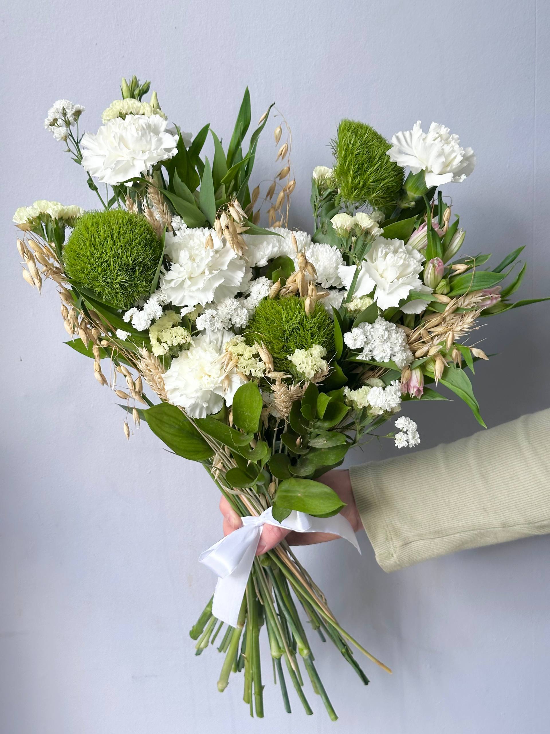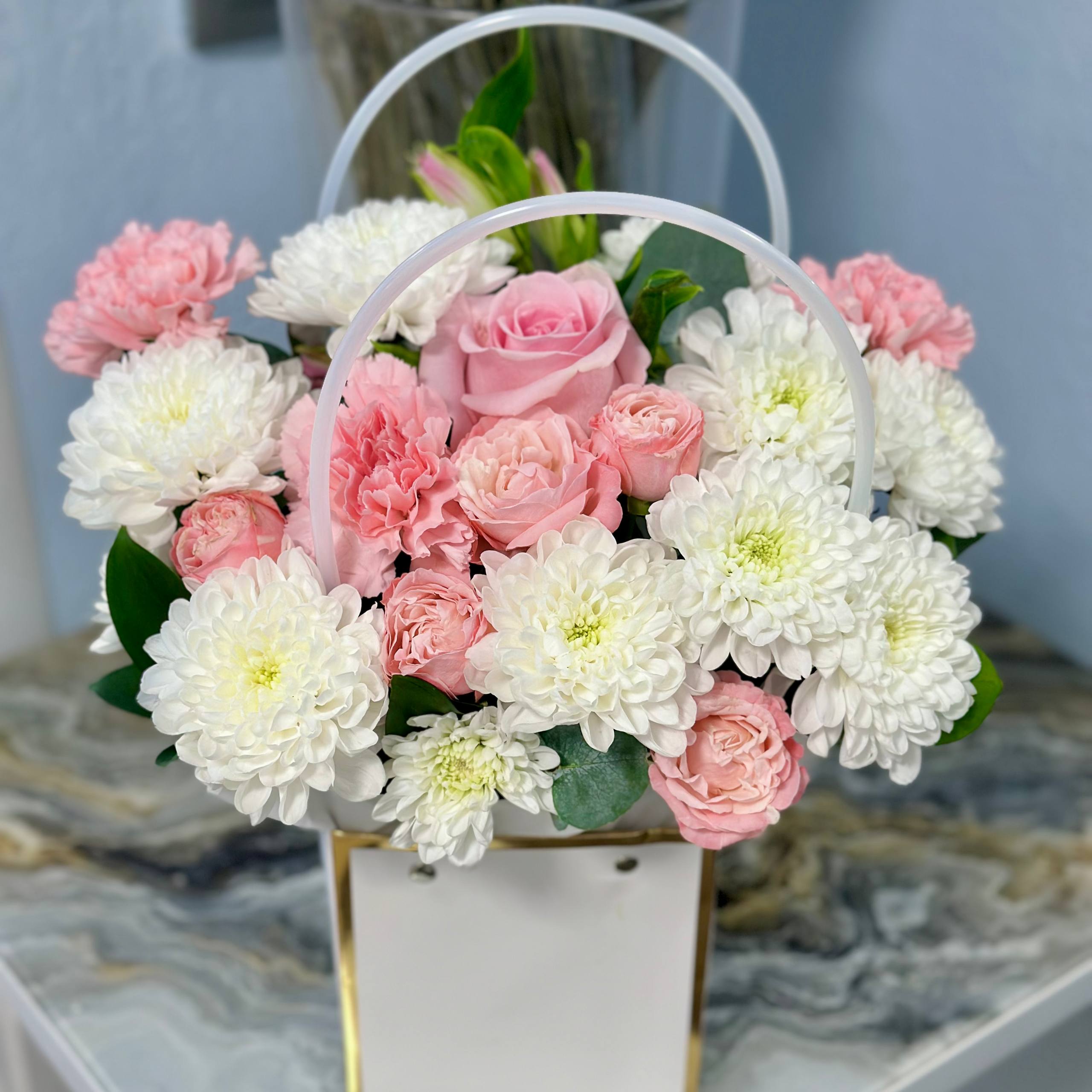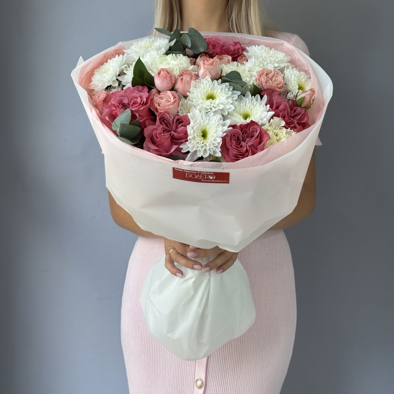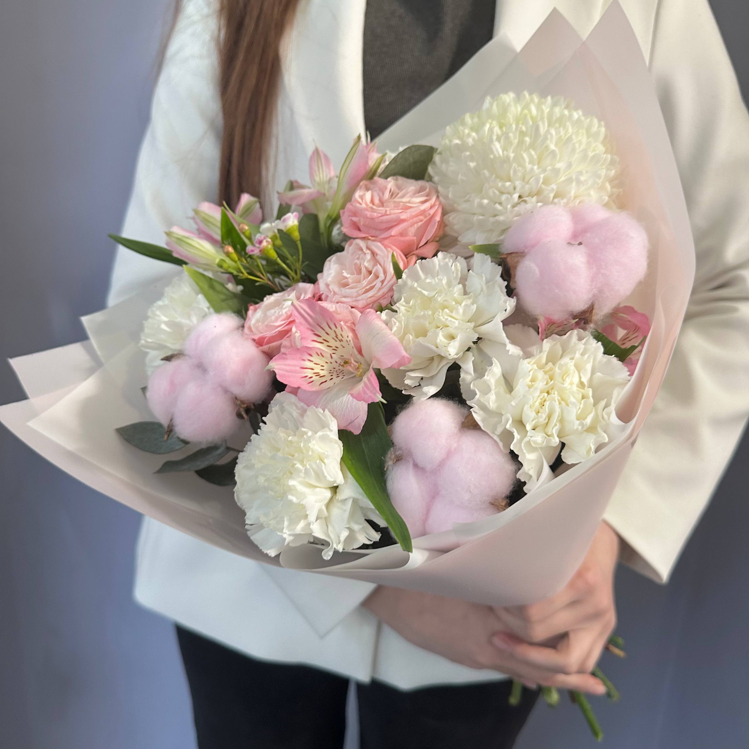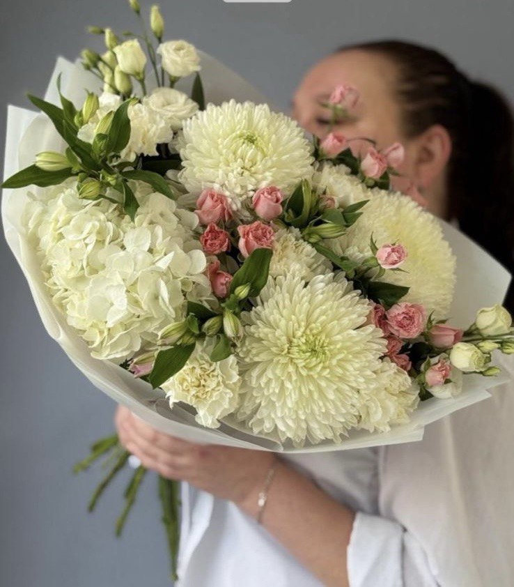 Белые хризантемы, пудровые гвоздики, розовые розы и белая эустома собраны в свежую, живую композицию с зеленью альстромерии. Букет получается очень тёплым и внимательным — таким можно поддержать, поздравить или просто напомнить о себе близкому человеку. Светлая упаковка подчёркивает чистоту палитры.