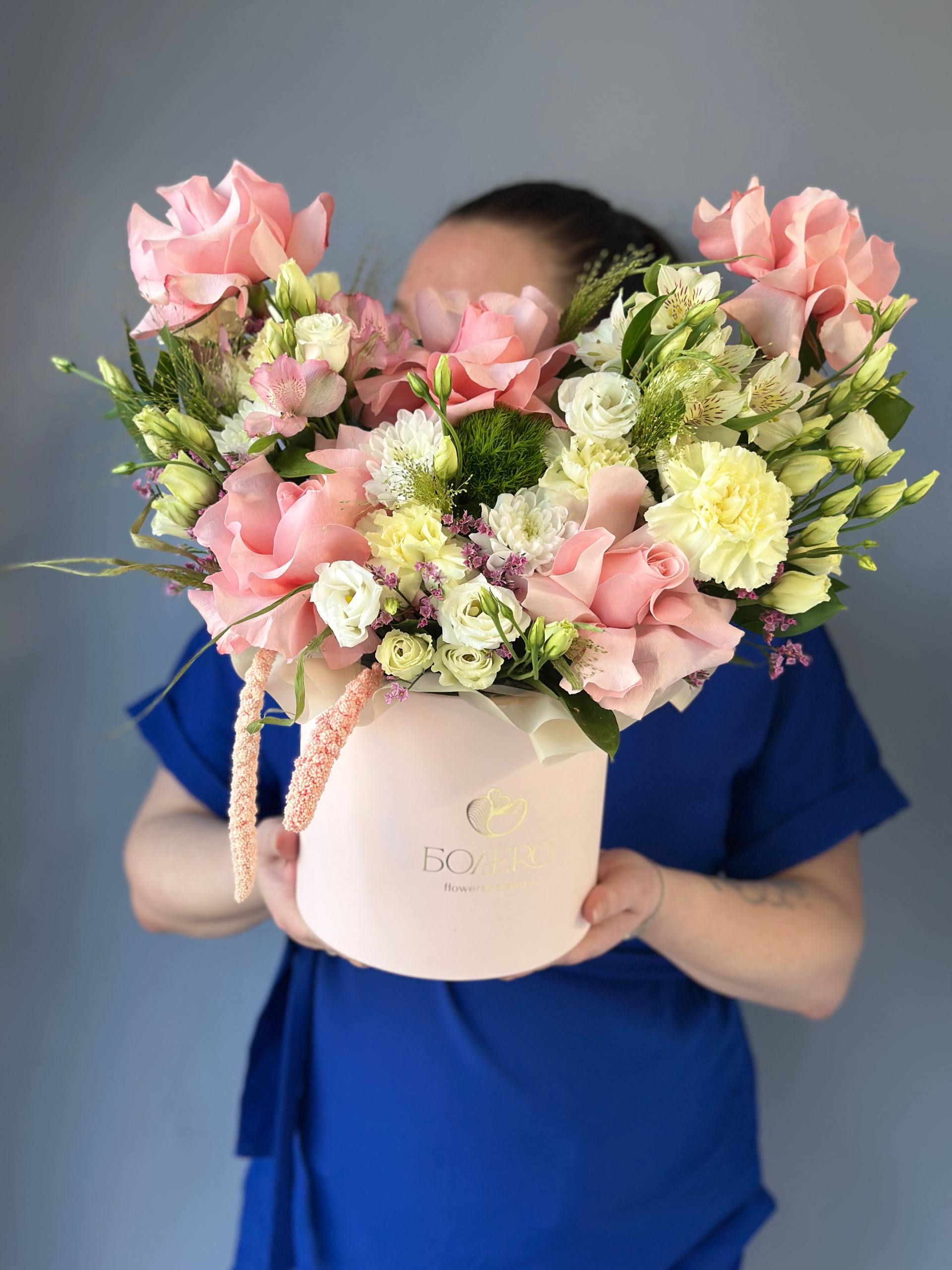 Крупные белые хризантемы, пудровые гвоздики, розовые кустовые розы и альстромерия собраны в шляпную коробку и дополнены хлопком и мягкими злаками. Композиция выглядит очень заботливо и камерно — такой формат удобно подарить маме или просто близкому человеку, когда хочется показать внимание. Зелень и эвкалипт добавляют живости и объёма.