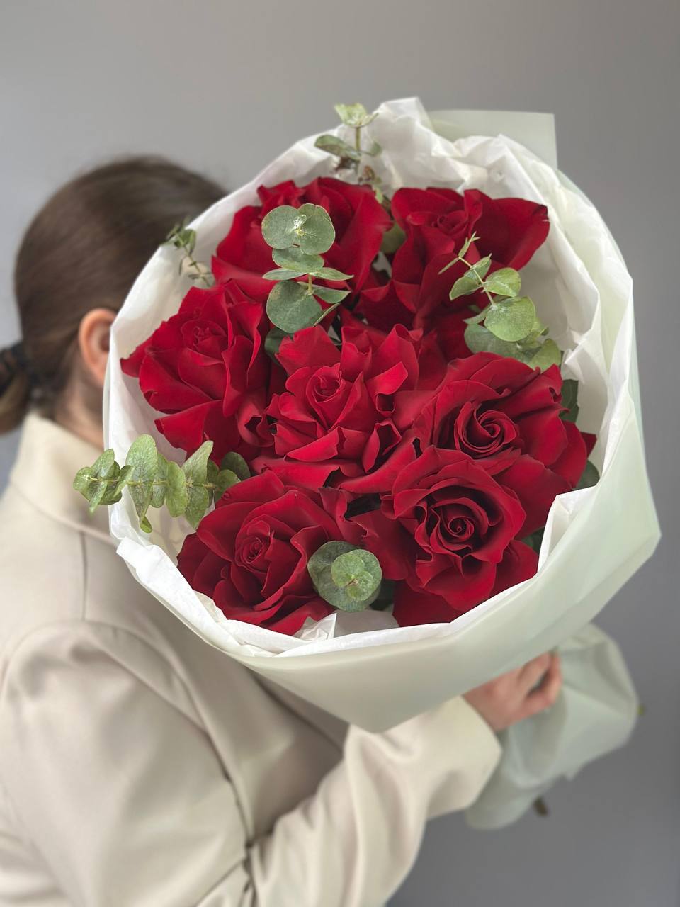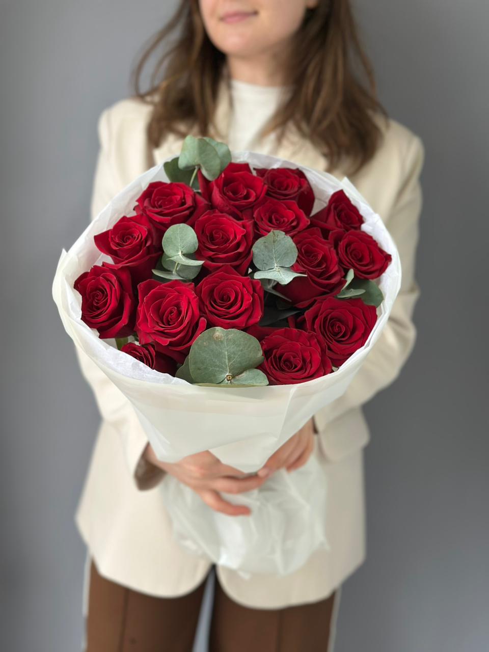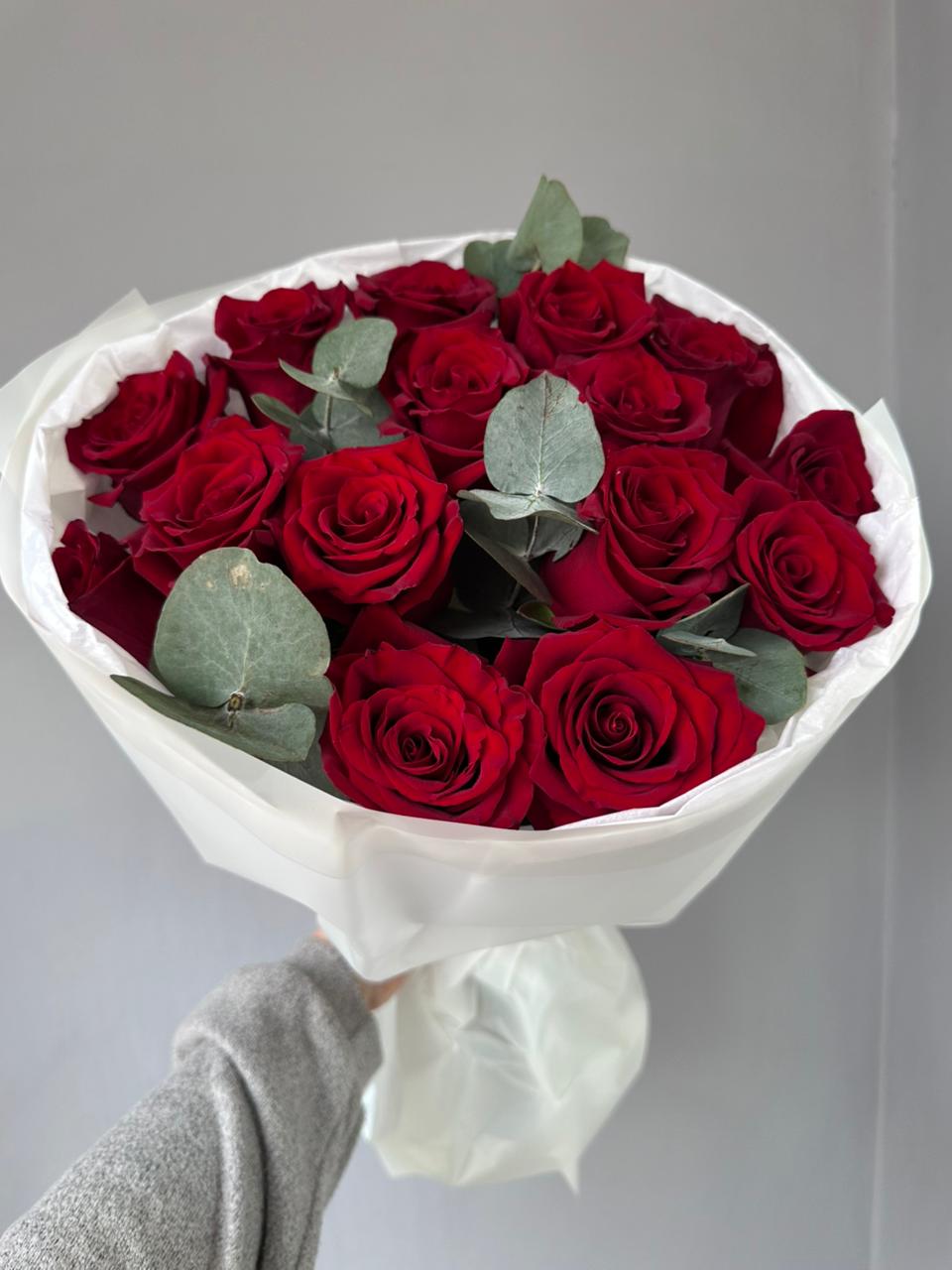 Подарите страсть и элегантность с шикарным букетом красных роз в обрамлении изящного эвкалипта от цветочной мастерской «Болеро» в Екатеринбурге. Этот вывернутый букет — современная классика, где каждая роза раскрывается наружу, демонстрируя свою идеальную форму и бархатную глубину цвета.