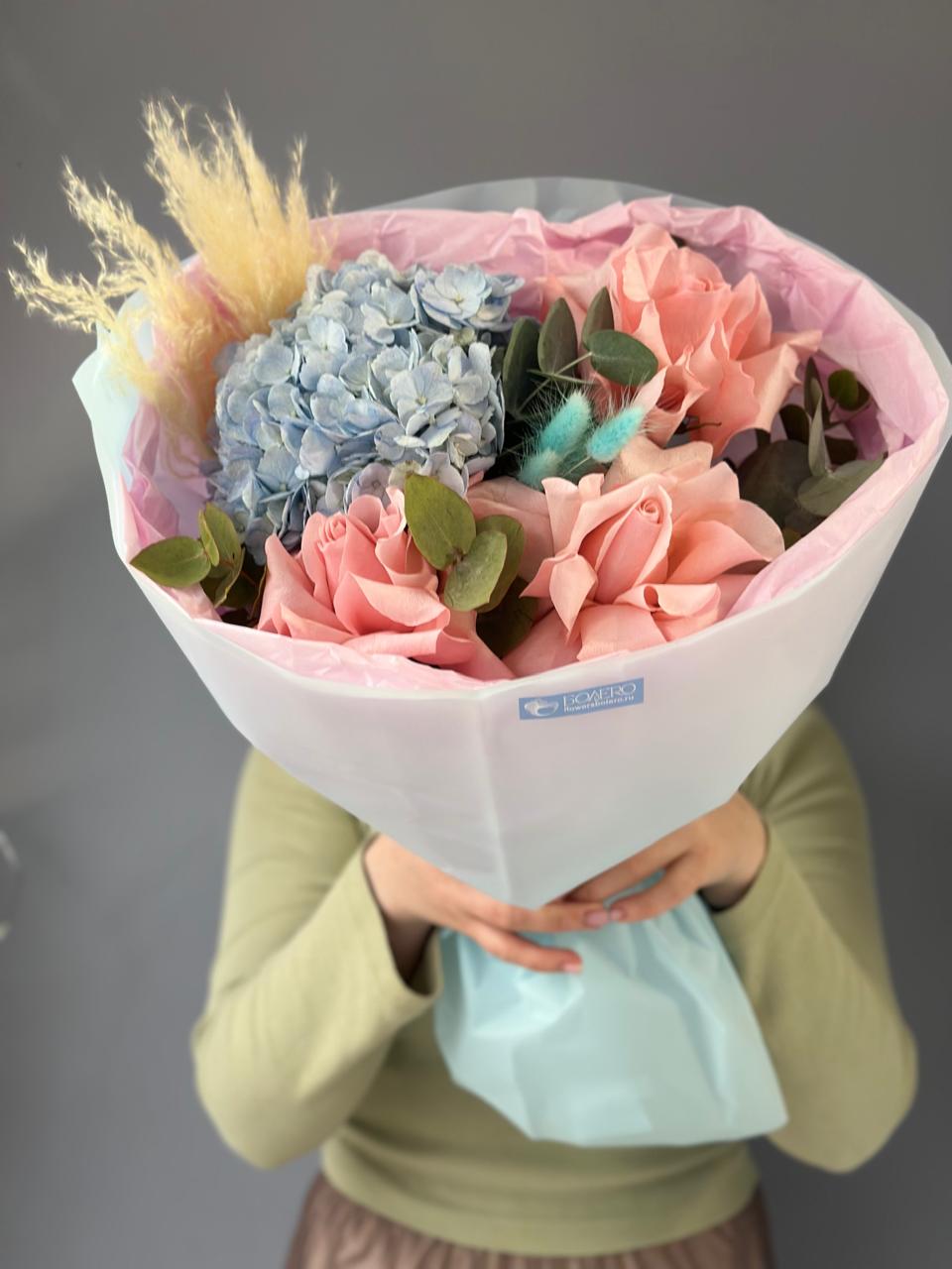Белая гортензия, розовые розы и гвоздики собраны в мягкой, пудровой палитре, которую поддерживают альстромерии и хлопок. Букет выглядит очень заботливо — как тихое поздравление или тёплый подарок близкому человеку. Аккуратная упаковка держит форму и не отвлекает от цветов.