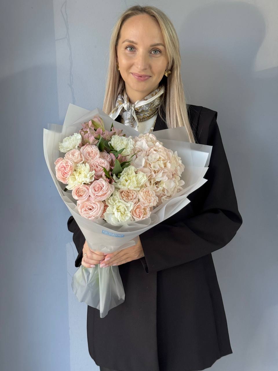 Воздушный букет в розово-кремовой гамме: гортензия нежного розового оттенка, кустовые и классические розы, кремовые гвоздики и светлые альстромерии. Объёмная форма и мягкие переходы цветов создают ощущение спокойствия и заботы.