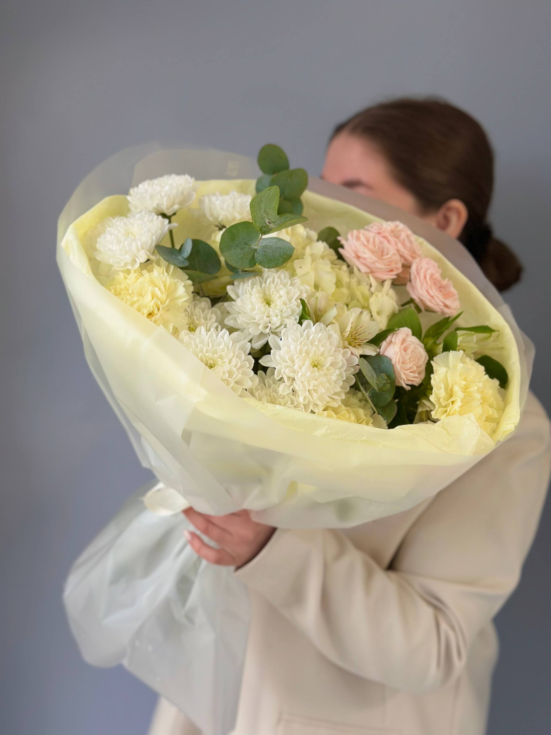 Объёмный букет в светло-розовой и молочной палитре: белая гортензия, кремовые розы, розовые кустовые розы, гвоздики, альстромерии и немного эвкалипта. Мягкие фактуры и плавные переходы оттенков создают ощущение тишины и заботы.