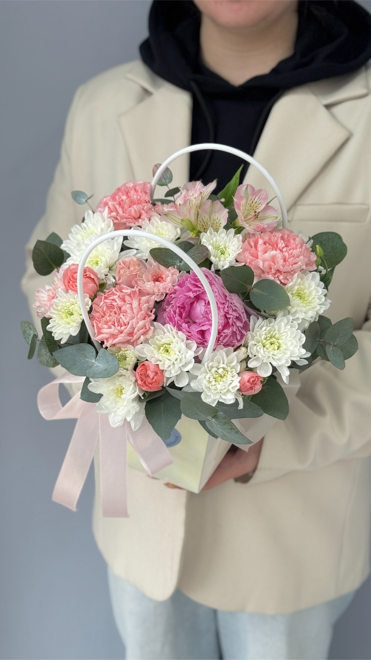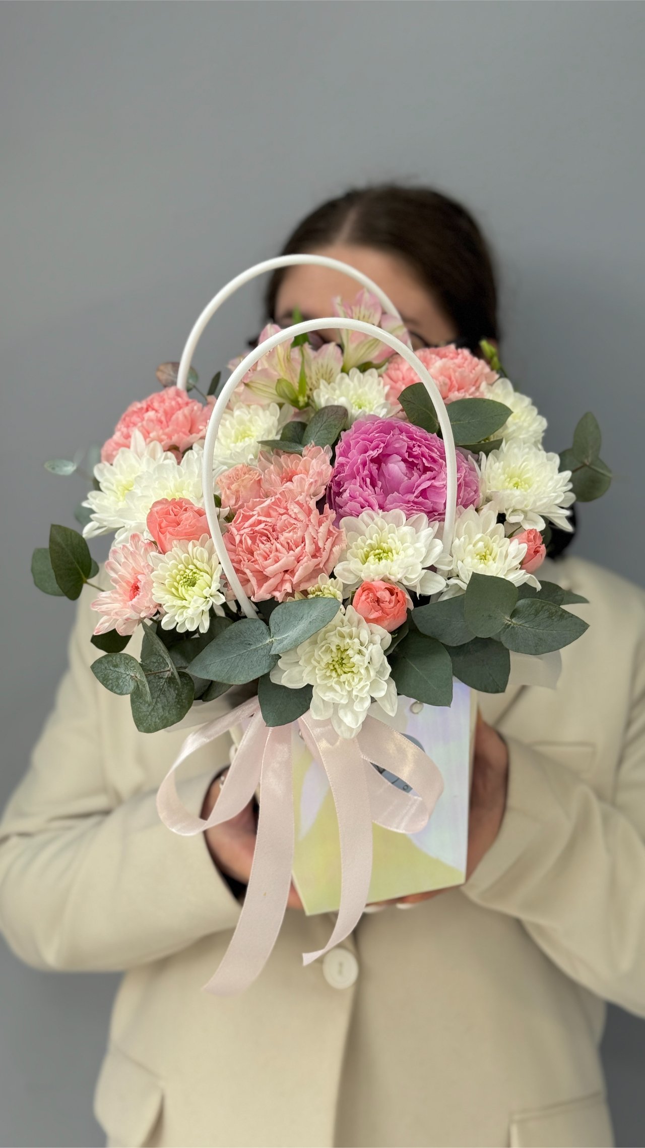 Композиция в декоративной сумочке собрана из розовых гвоздик, белых хризантем, нежных кустовых роз и веточек эвкалипта. Мягкая палитра и округлая форма создают ощущение света, внимания и спокойного тепла. Это аккуратный подарок для момента, когда важно сказать о чувствах без лишней громкости.