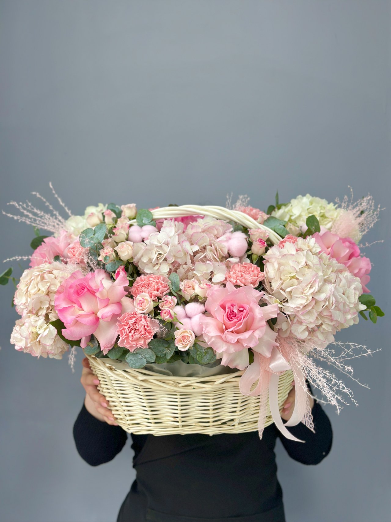 Объёмная корзина в нежной палитре собрана из розовых роз, гортензии, кустовых роз, гвоздик и эвкалипта, с лёгкими воздушными акцентами сухоцветов. Мягкая форма и спокойные оттенки создают ощущение тепла, света и бережного внимания. Это композиция для момента, когда хочется подарить не просто цветы, а состояние тишины и заботы.
