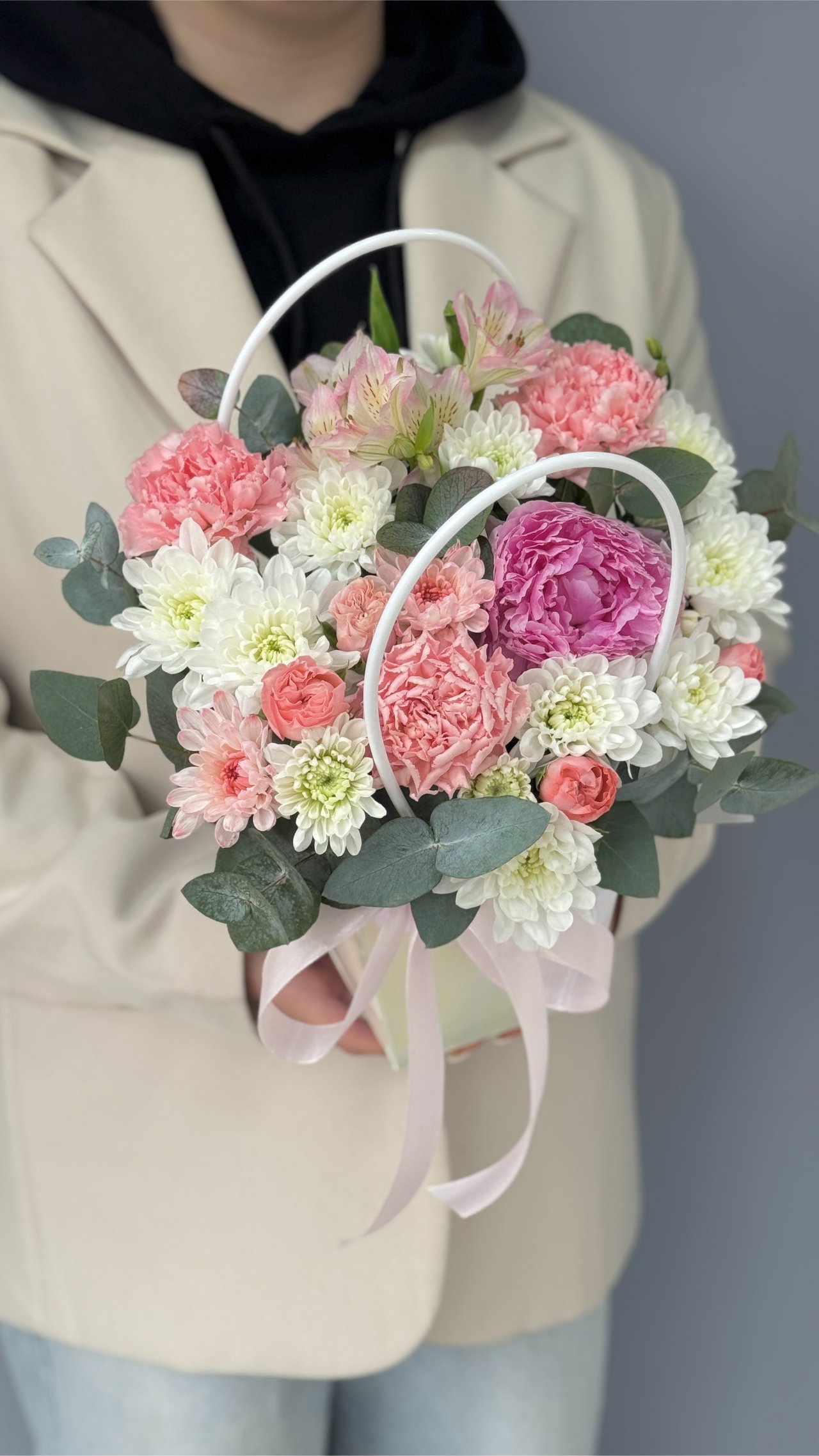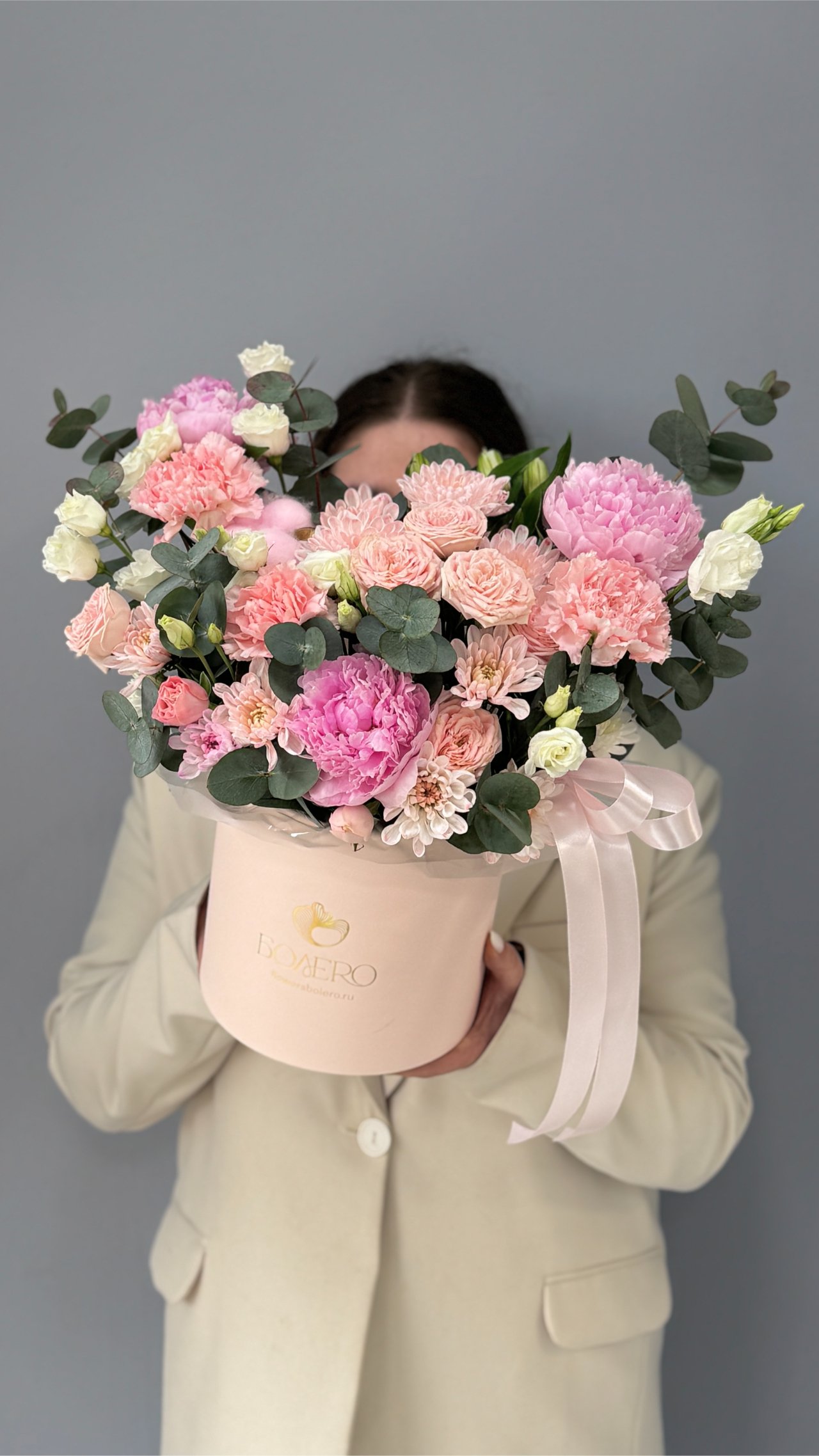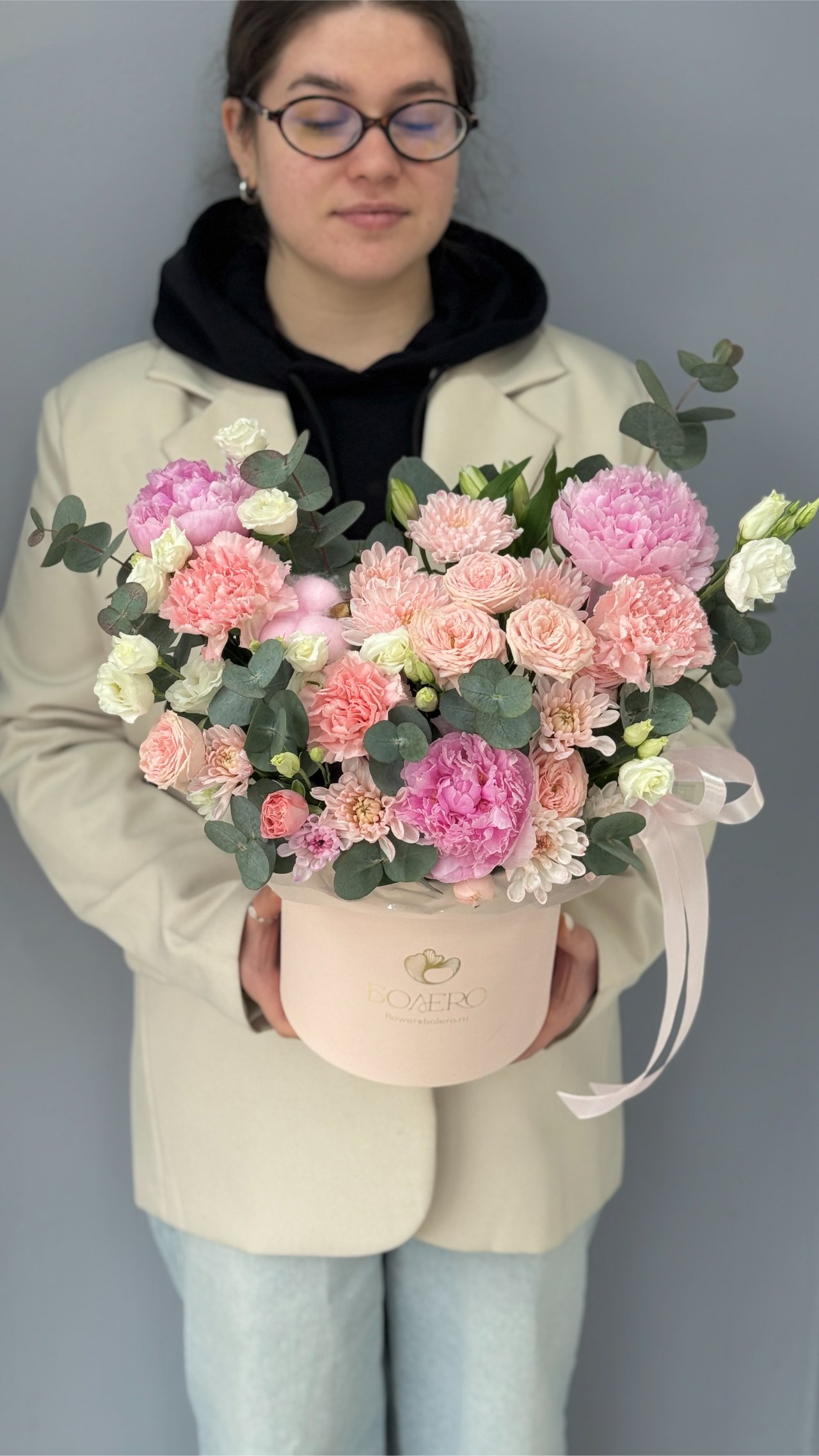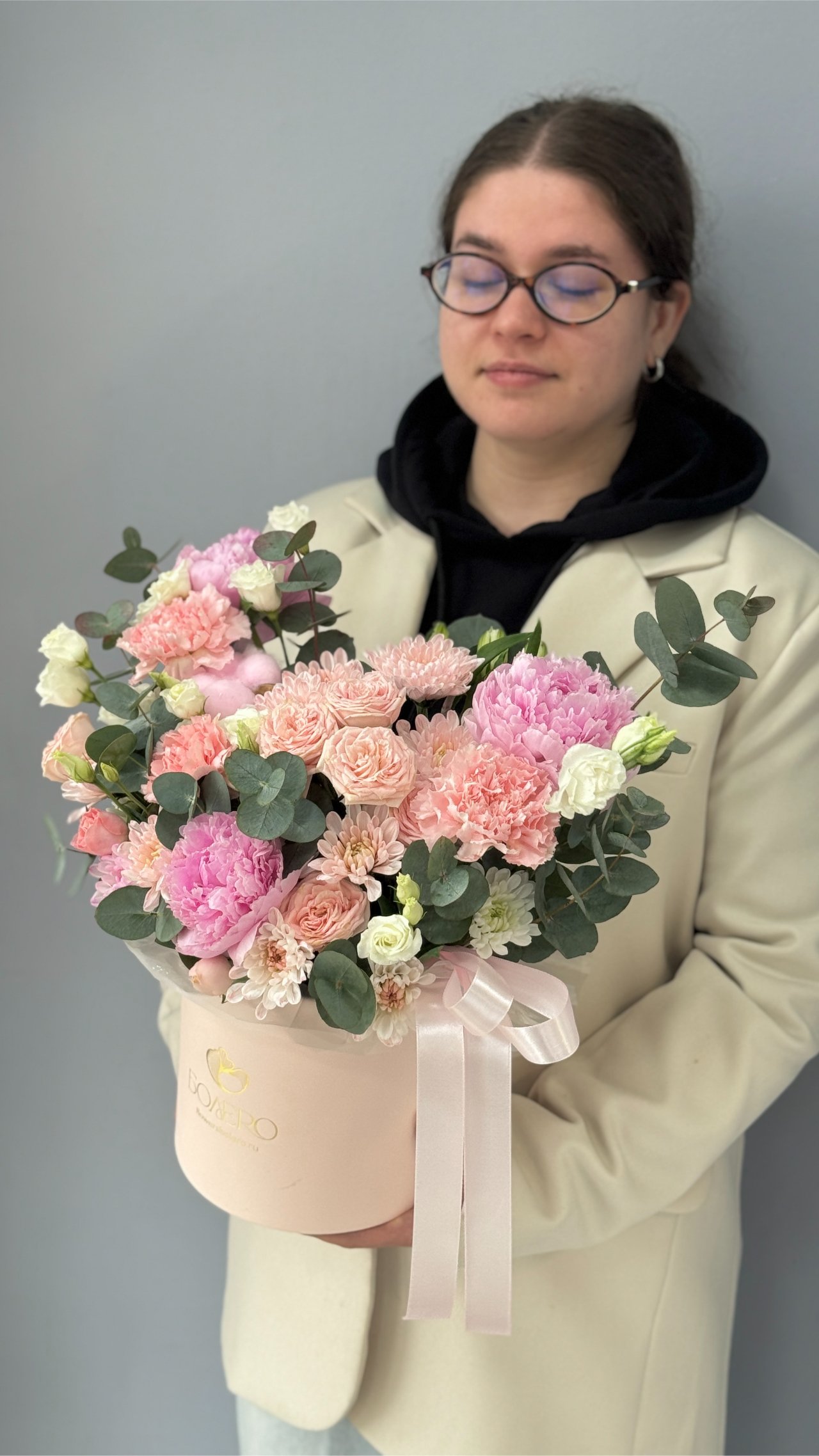 Объёмная композиция в коробке собрана из розовых пионов, кустовых роз, гвоздик, светлых хризантем, эустомы и эвкалипта. Мягкая палитра и свободная форма создают ощущение тишины, тепла и бережного внимания. Это спокойный жест, в котором есть свет, дыхание и внутреннее равновесие.