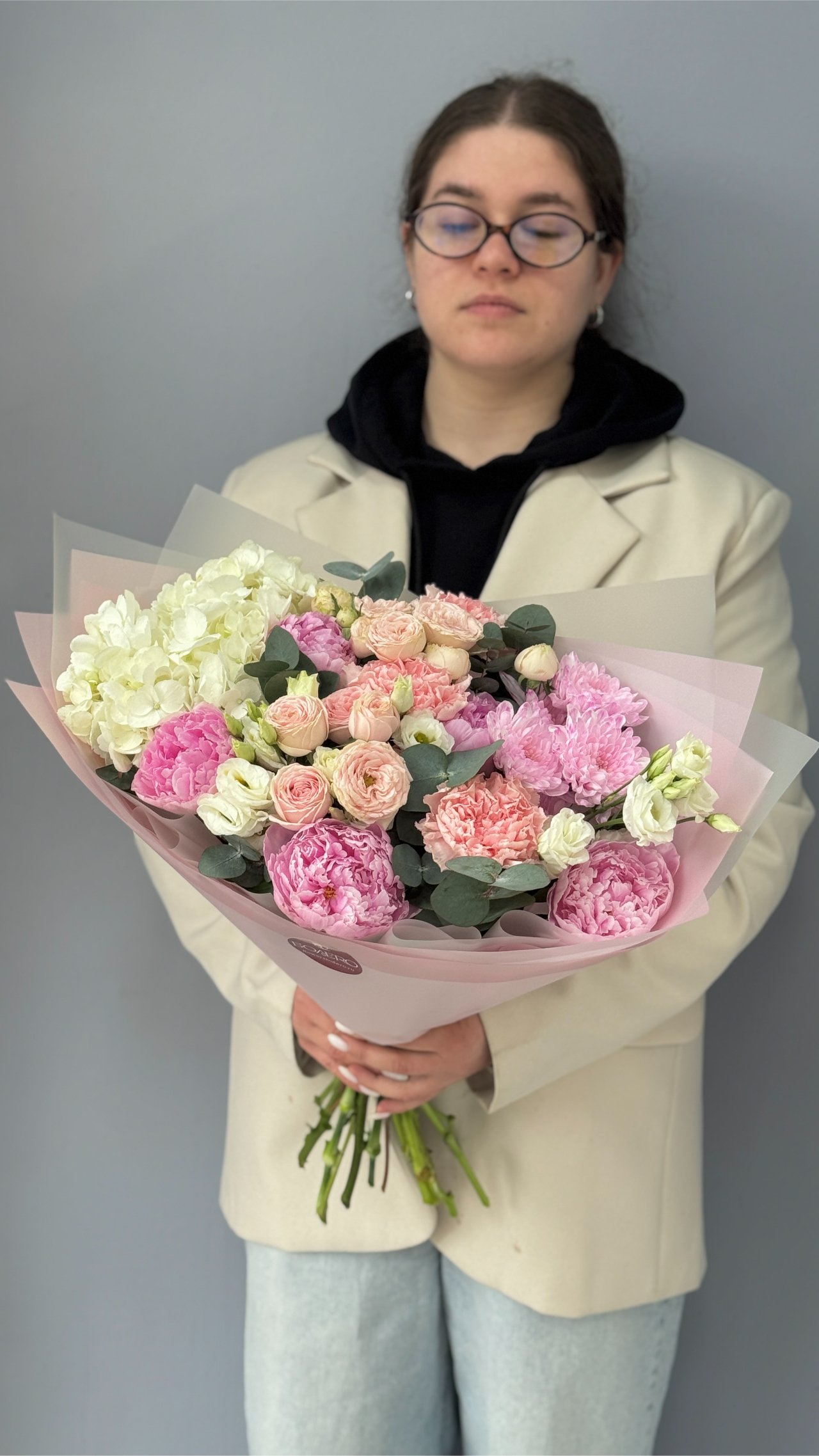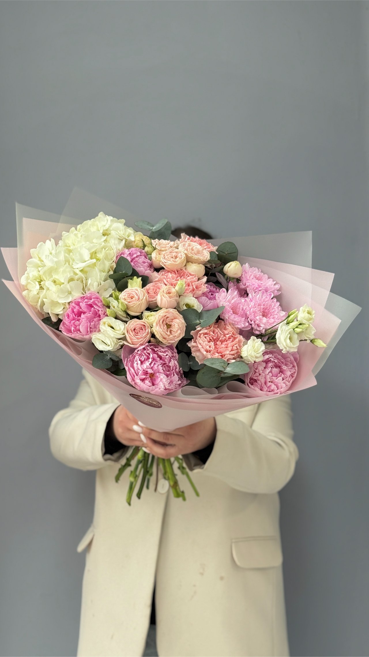 Объёмный букет в мягкой палитре: белая гортензия, розовые пионы, кустовые розы, гвоздики, светлые хризантемы, эустомы и эвкалипт. Разные фактуры собираются в спокойную, живую форму, где есть и воздух, и плотность. Такой букет звучит как тёплый жест внимания — светло, бережно, без лишней громкости.