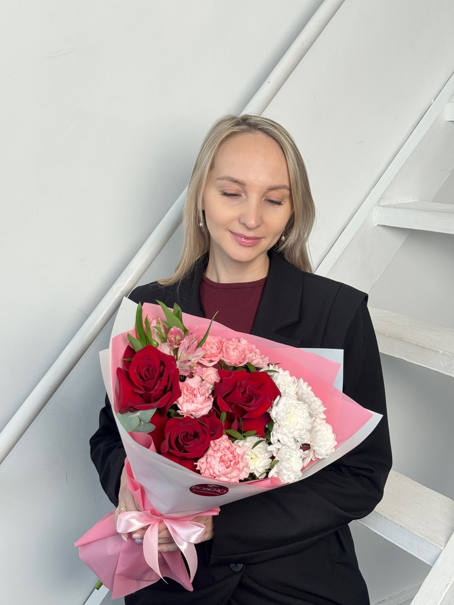 Бордовые розы доминируют и задают тон, розовые гвоздики и белые хризантемы добавляют баланса и объёма — цвета глубокие, но не агрессивные, гармоничные. Букет плотный, держит форму отлично, выглядит дорого и профессионально. Это классический корпоративный выбор: поздравляет тепло, передаёт уважение и благодарность, подходит для офиса, не создаёт неловкости и сразу запоминается.