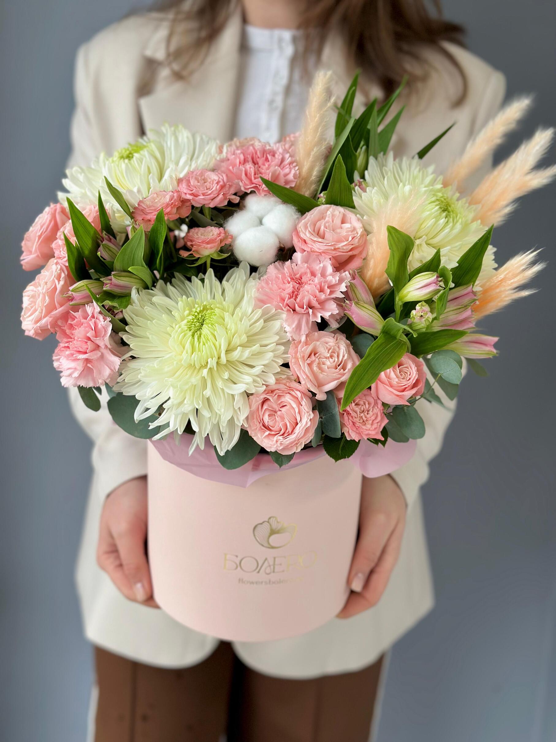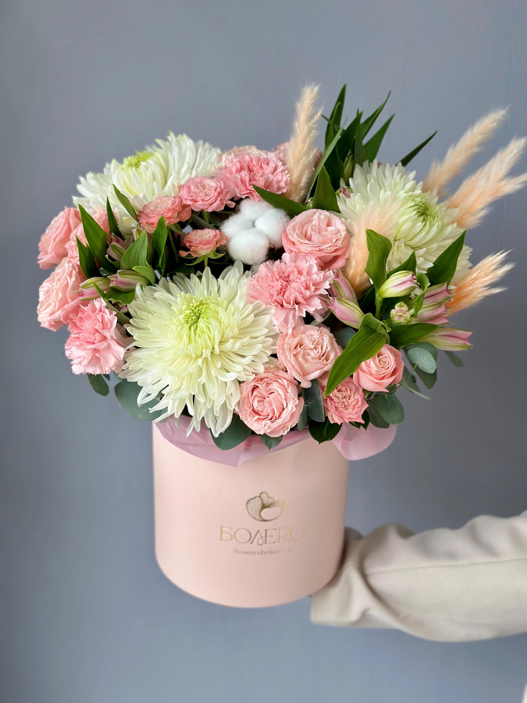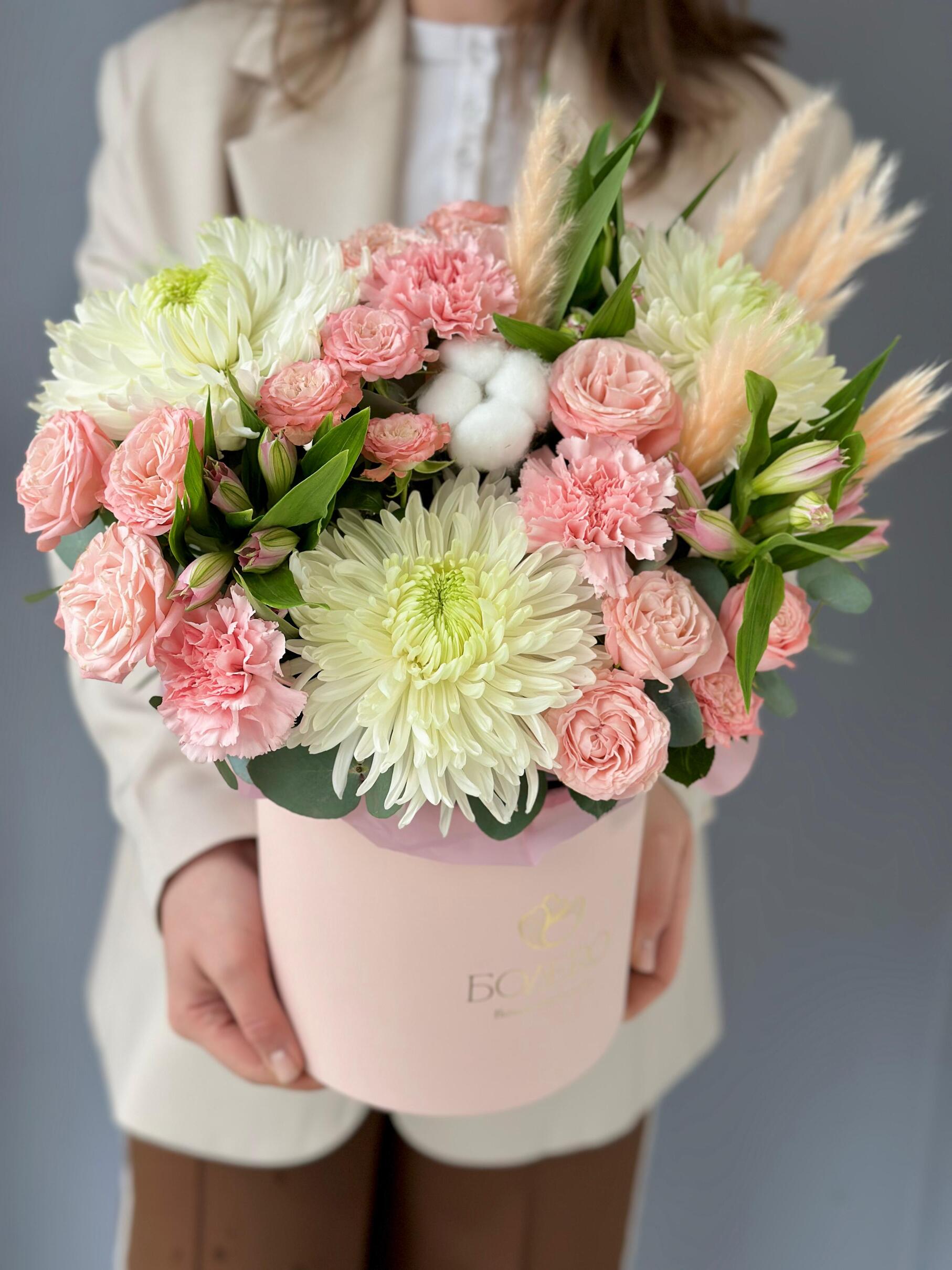 Крупные белые хризантемы, пудровые гвоздики, розовые кустовые розы и альстромерия собраны в шляпную коробку и дополнены хлопком и мягкими злаками. Композиция выглядит очень заботливо и камерно — такой формат удобно подарить маме или просто близкому человеку, когда хочется показать внимание. Зелень и эвкалипт добавляют живости и объёма.