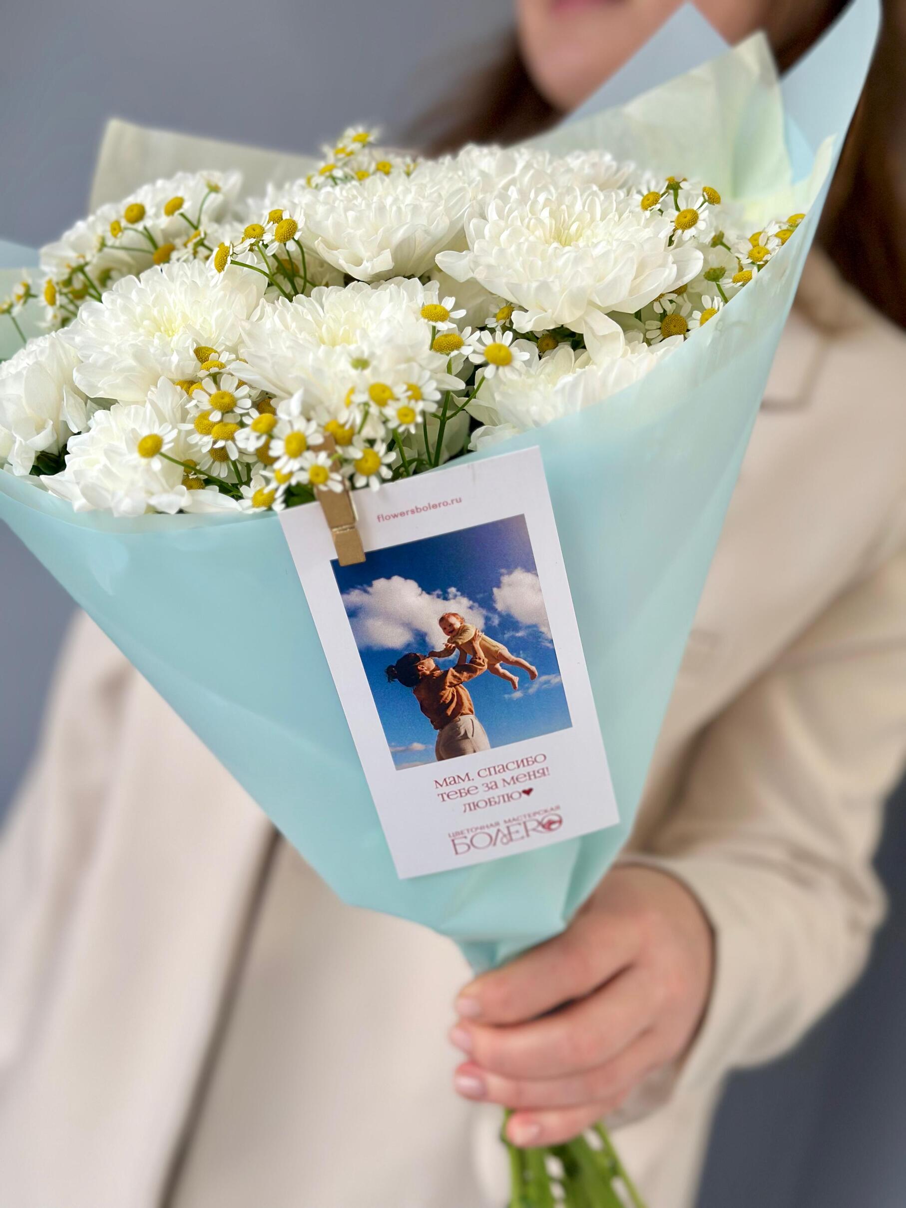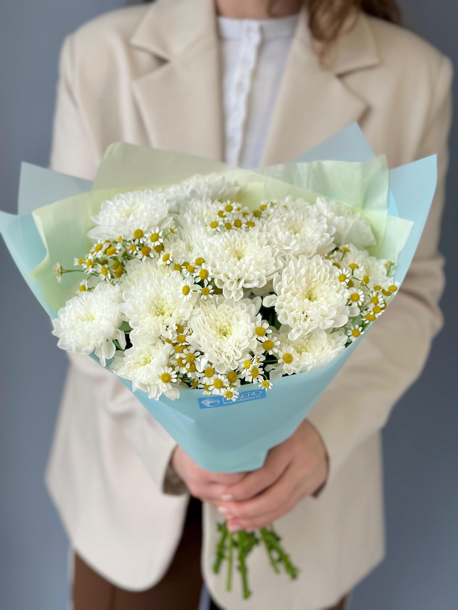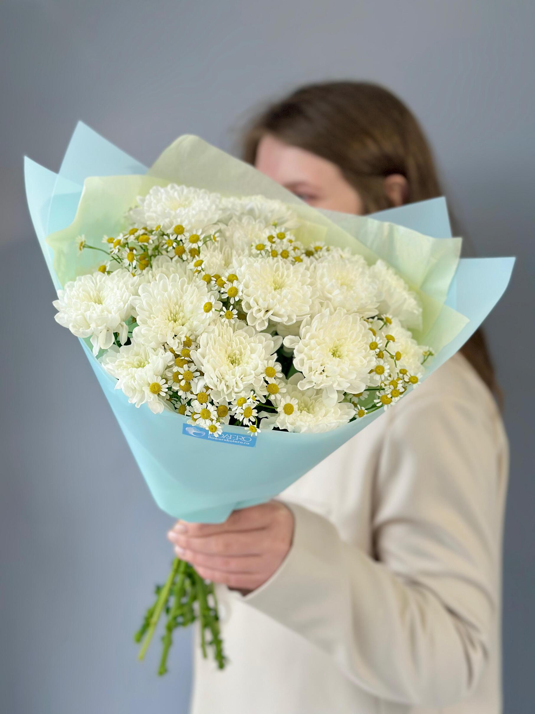 Белые хризантемы собраны плотно и аккуратно, с небольшими ромашковыми веточками — получается светлый, спокойный букет о внимании и нежности. Мягкая голубая упаковка подчёркивает чистоту оттенков. Такой жест легко подарить близкому человеку — без повода или в тёплый семейный день.