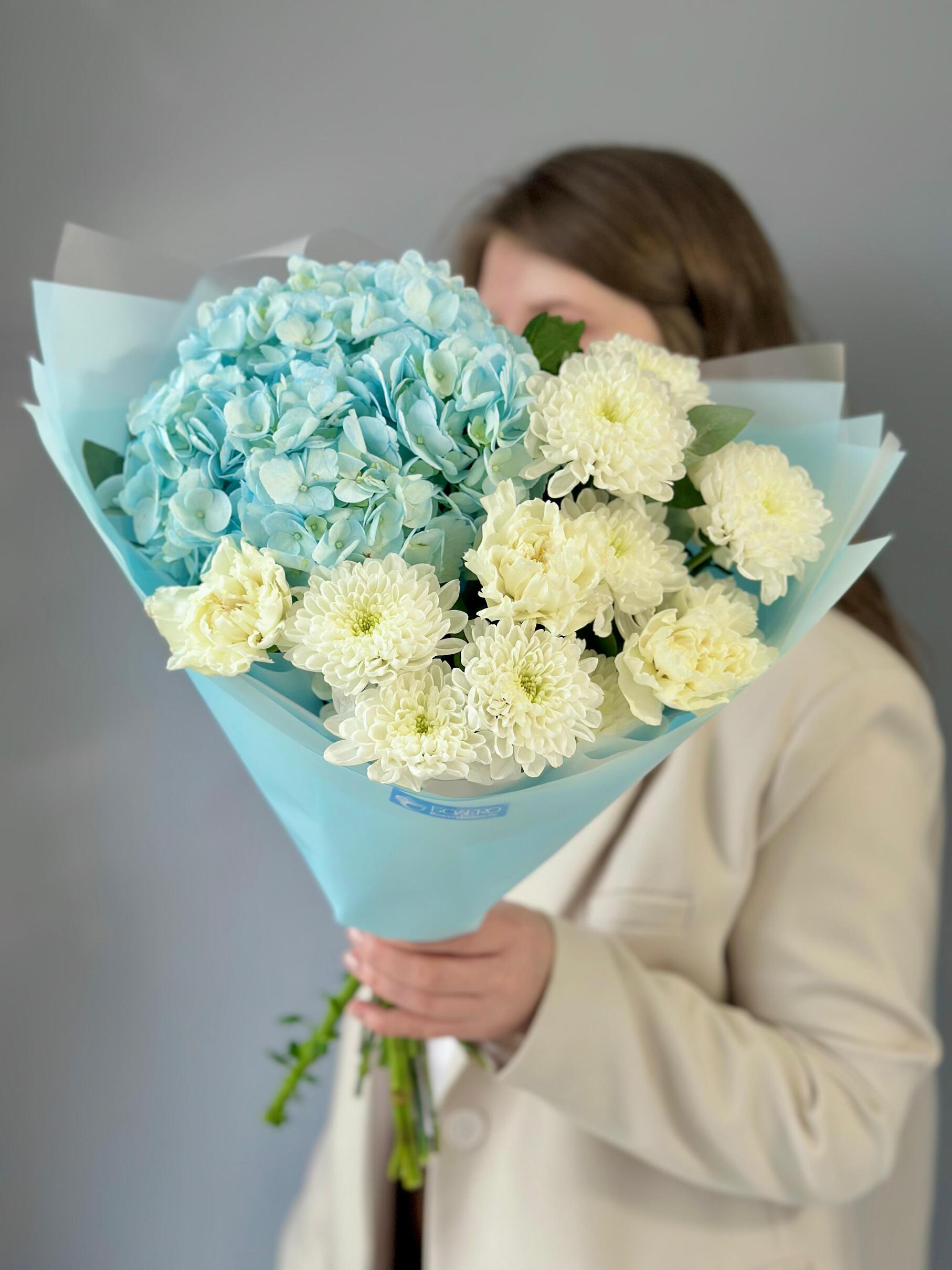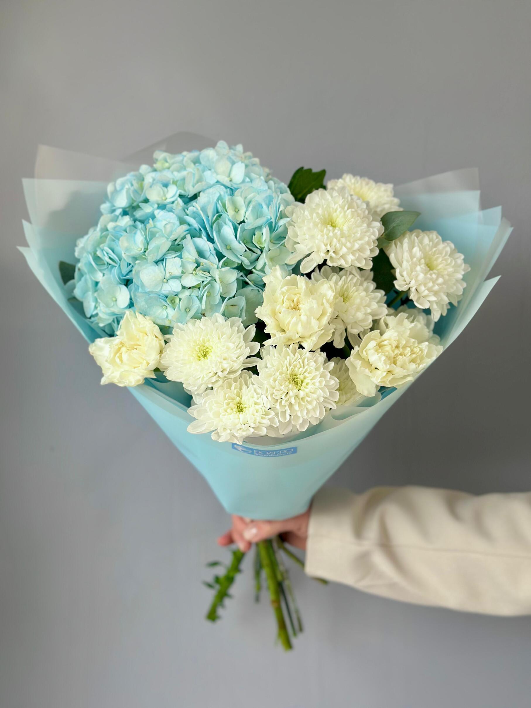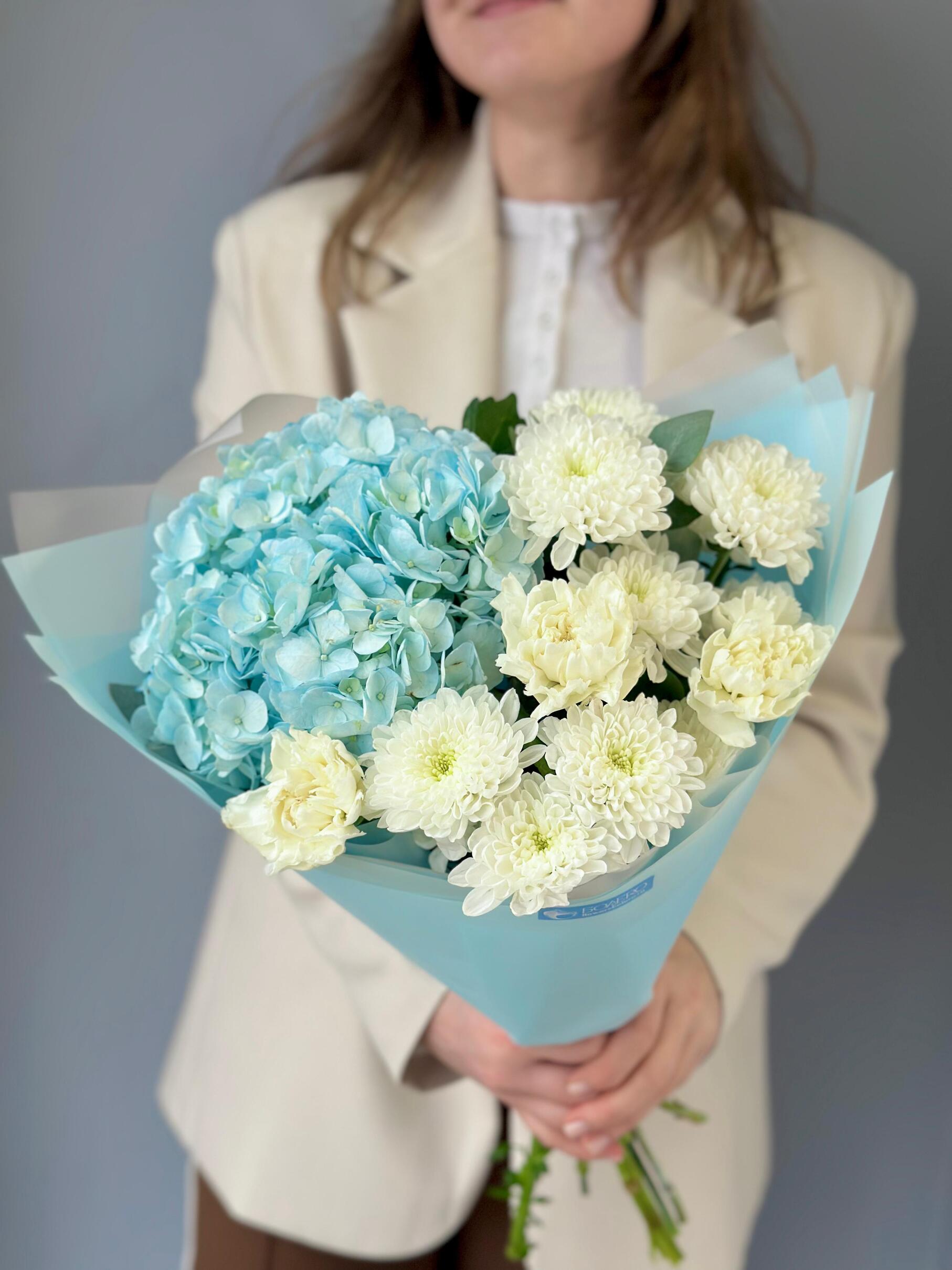 Голубая гортензия и белые хризантемы собраны в светлой палитре, которая даёт ощущение воздуха и спокойствия. Контраст нежного голубого и молочного делает букет особенно внимательным — таким можно сказать «я рядом» близкому человеку. Аккуратная упаковка поддерживает чистоту образа