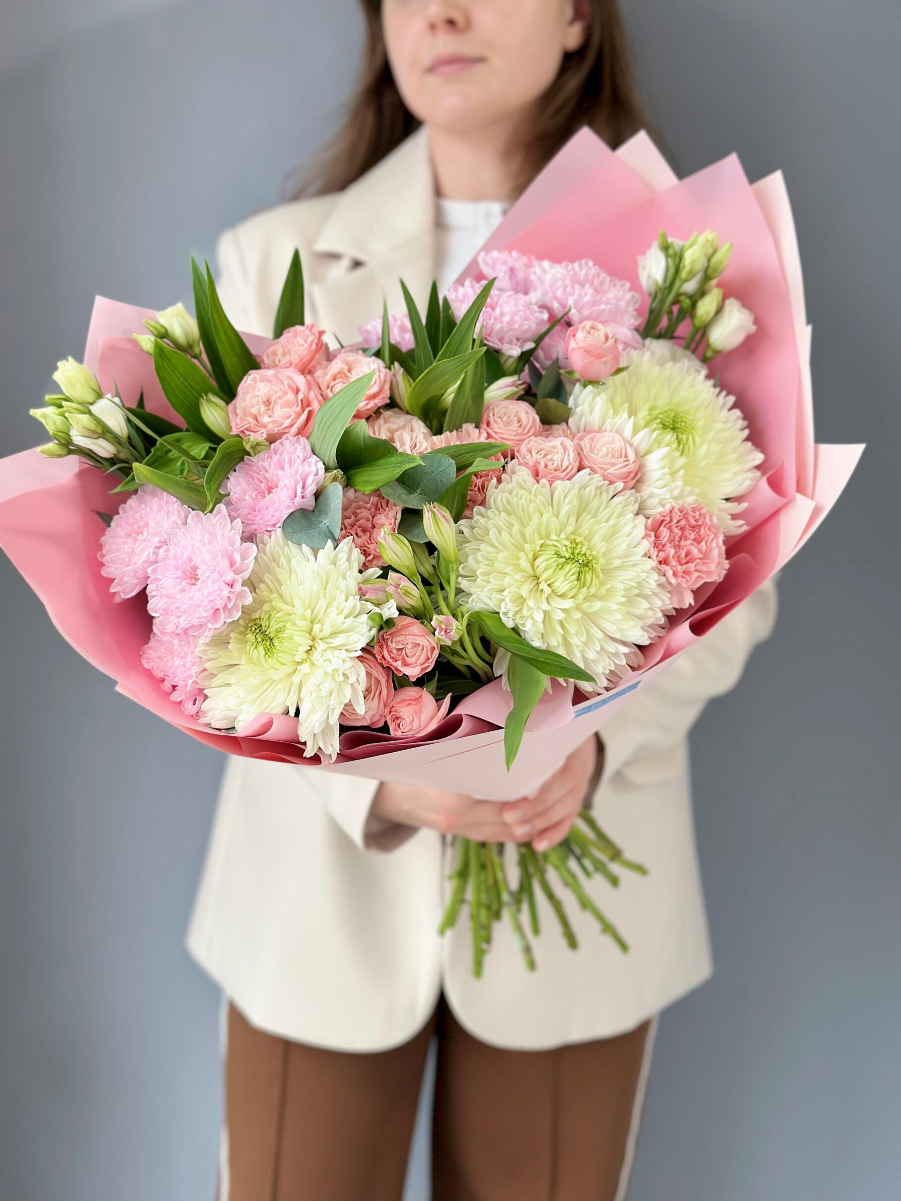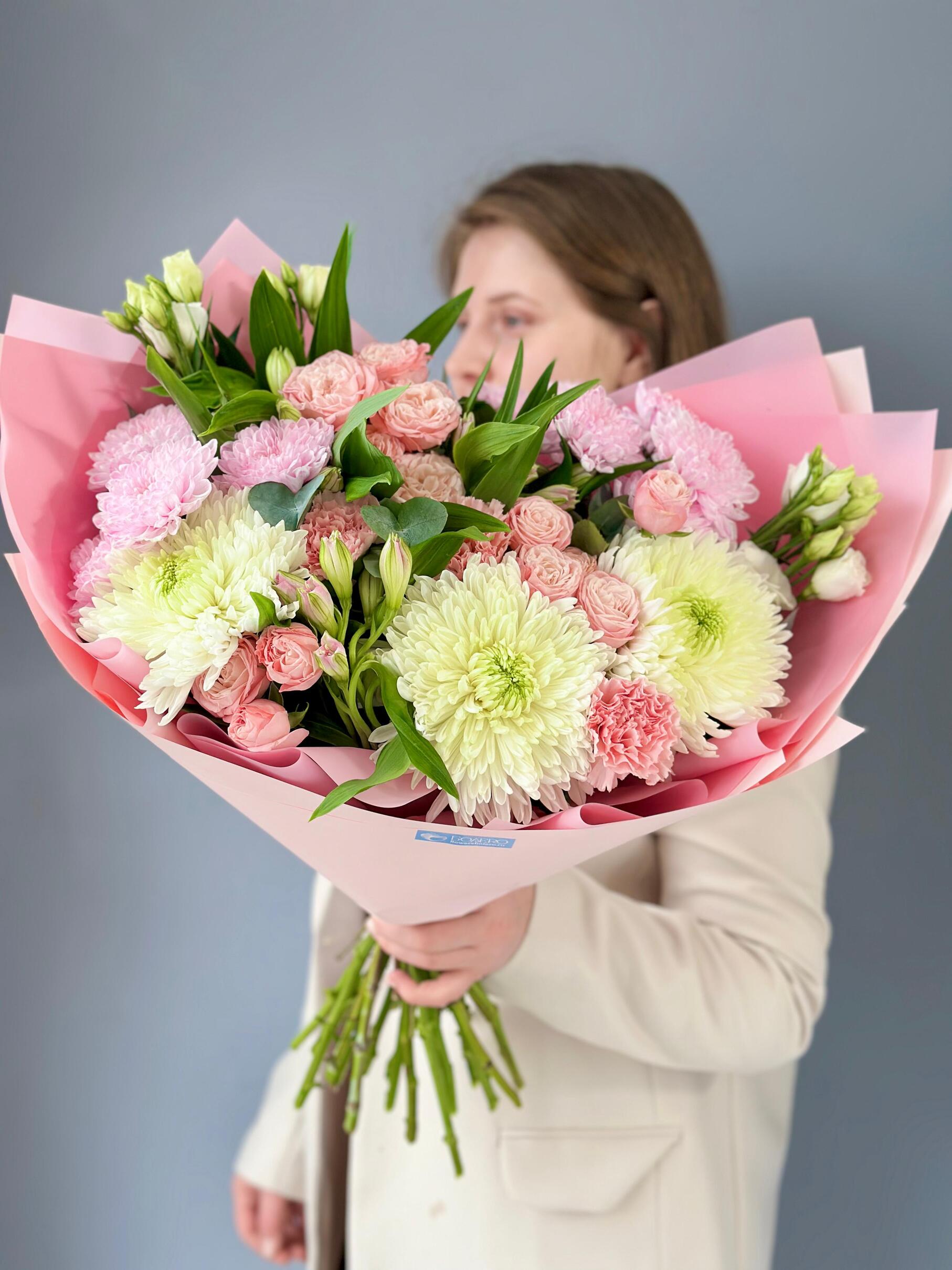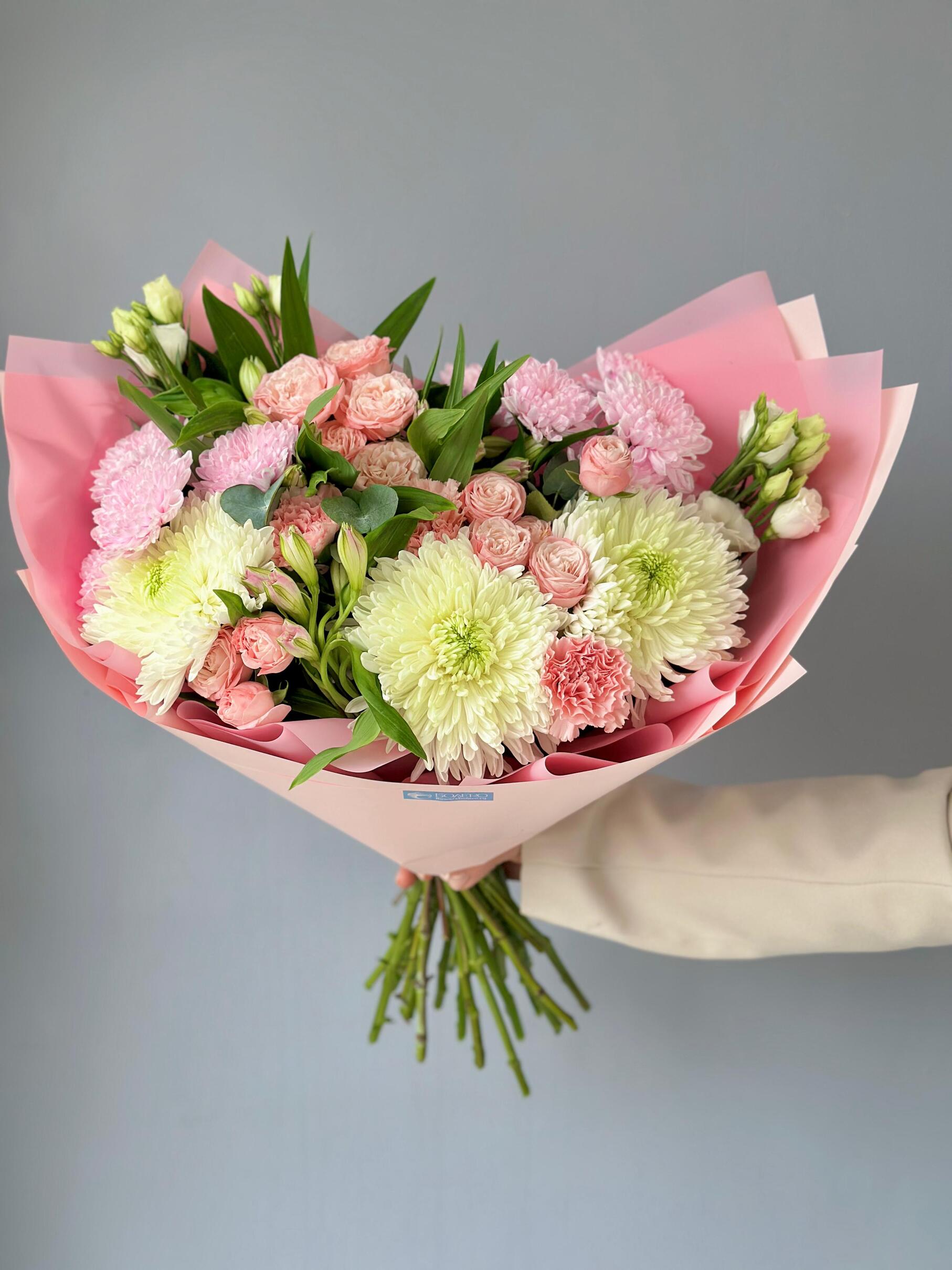 Крупные белые хризантемы, розовые кустовые розы, пудровые гвоздики и нежные хризантемы собраны в объёмный, живой букет с зеленью альстромерии и белой эустомой. Мягкая розовая упаковка поддерживает настроение заботы и внимания — такой букет легко подарить маме или просто дорогому человеку.