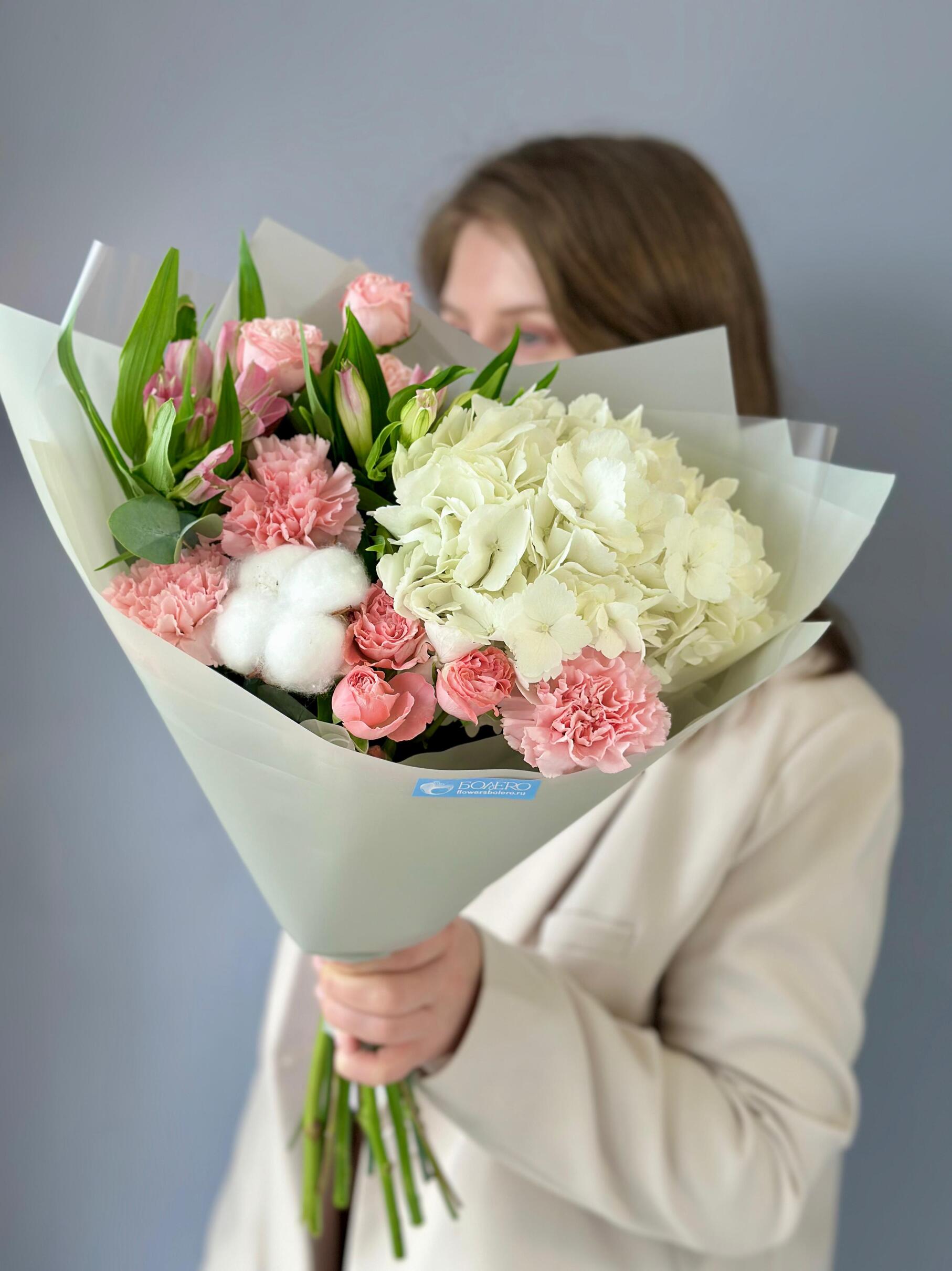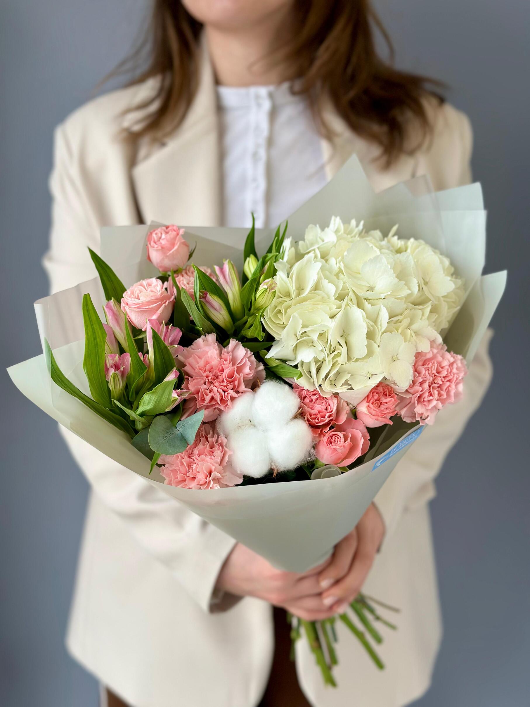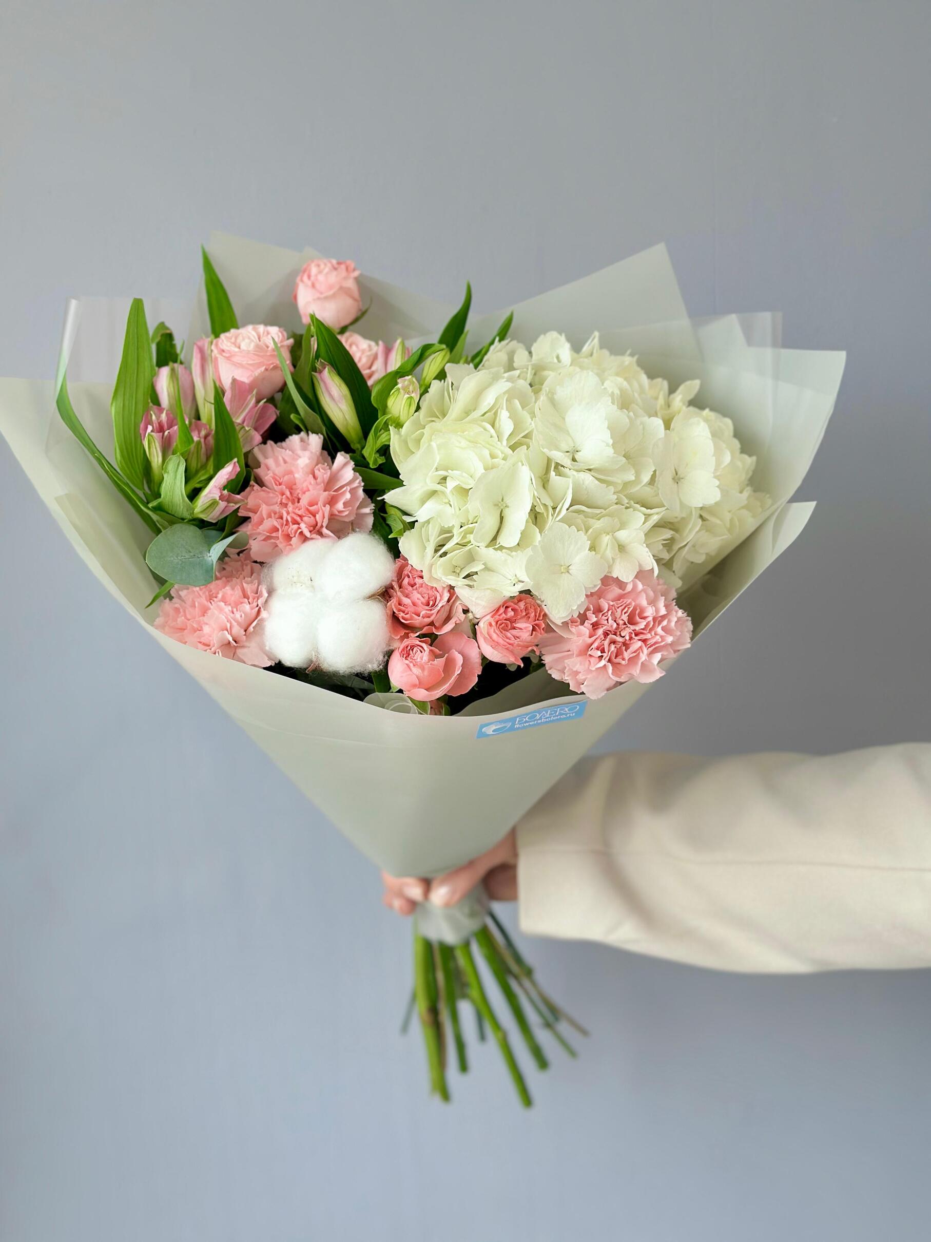 Белая гортензия, розовые розы и гвоздики собраны в мягкой, пудровой палитре, которую поддерживают альстромерии и хлопок. Букет выглядит очень заботливо — как тихое поздравление или тёплый подарок близкому человеку. Аккуратная упаковка держит форму и не отвлекает от цветов.