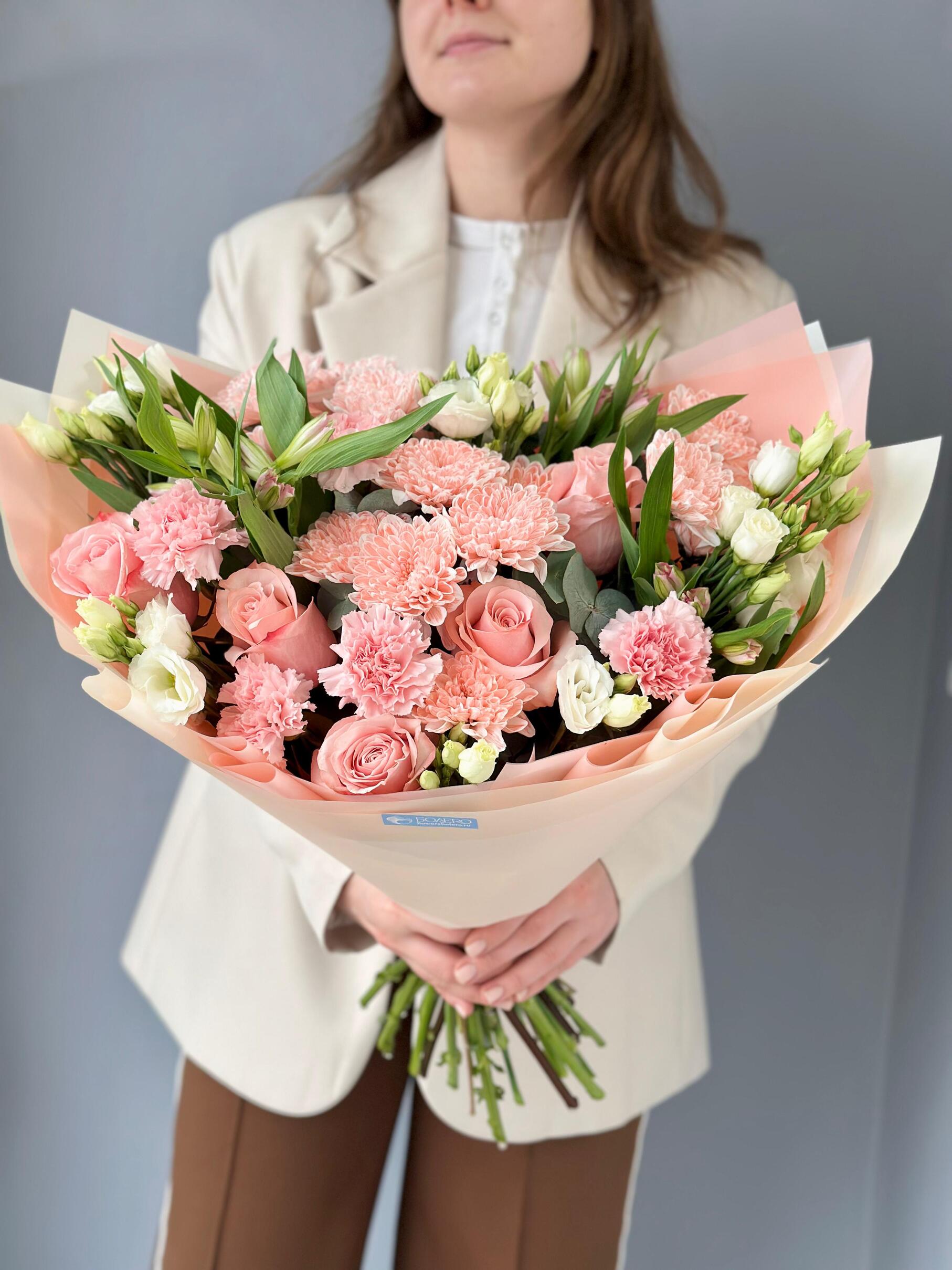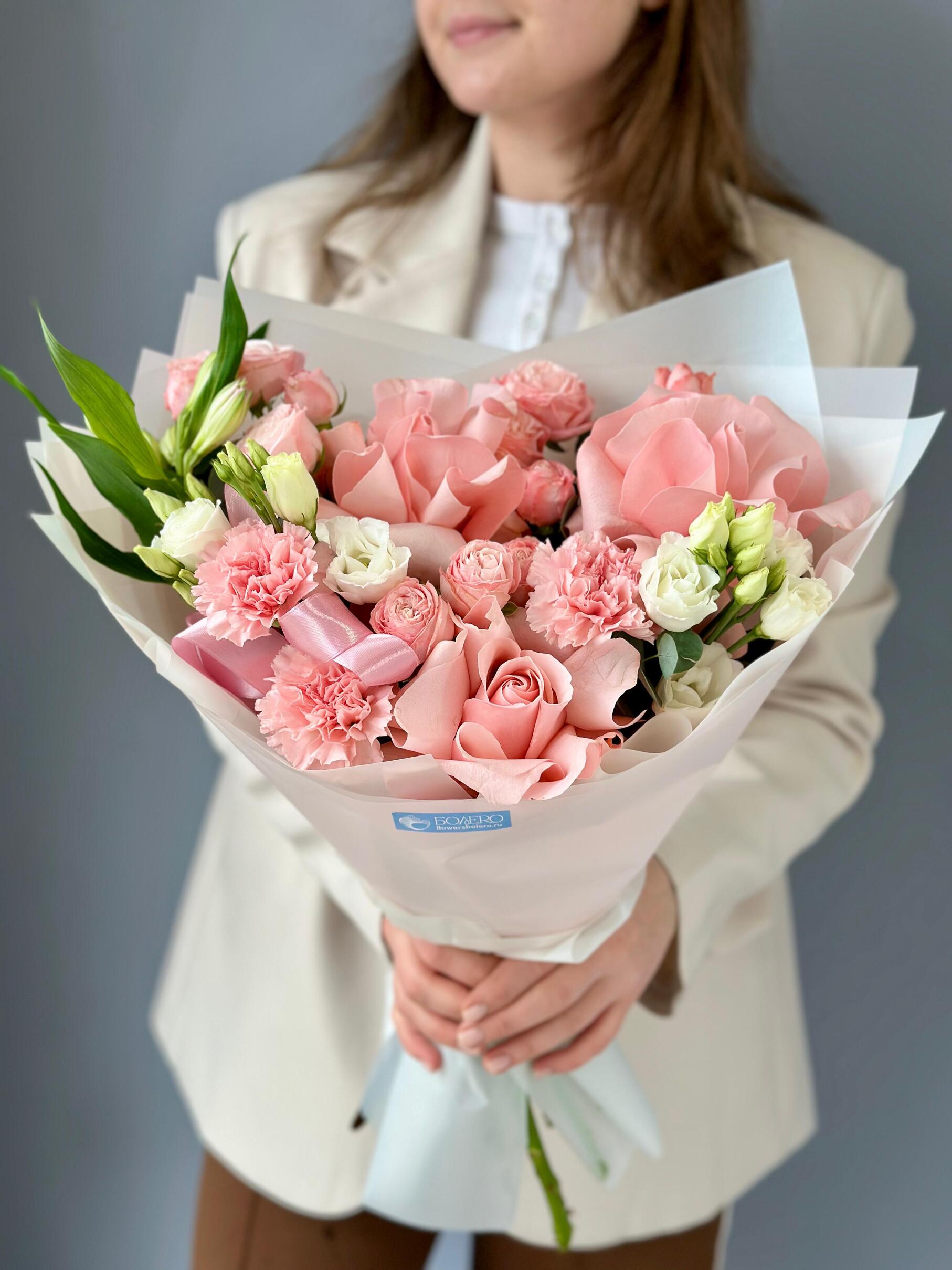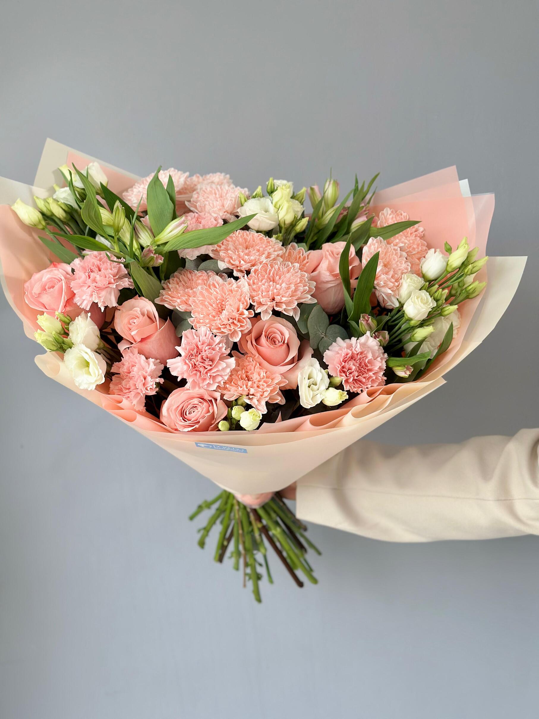 Розы в теплых розовых тонах, гвоздики, кустовые розы и белая эустома собраны в мягкую, женственную композицию с живой зеленью. Букет выглядит объёмным, но остаётся очень деликатным — таким легко сказать спасибо или подарить заботу близкому человеку. Светлая упаковка поддерживает ощущение чистоты и внимания к детали.