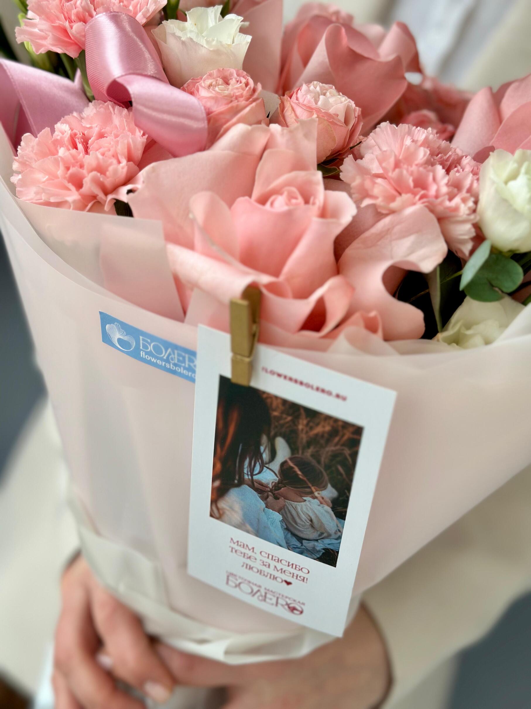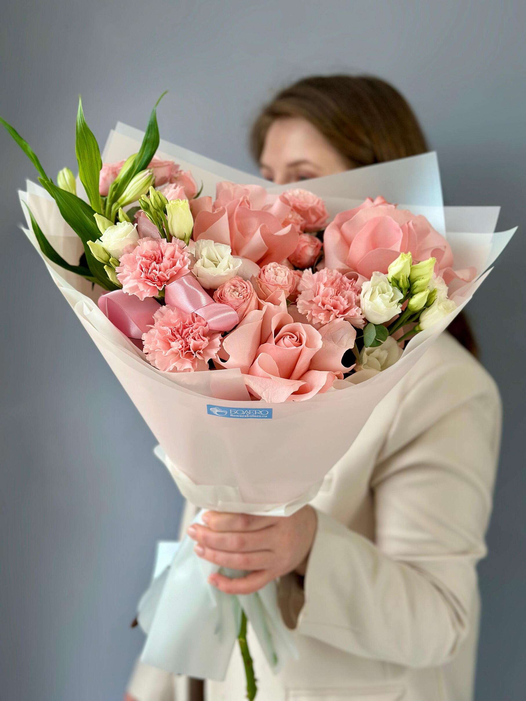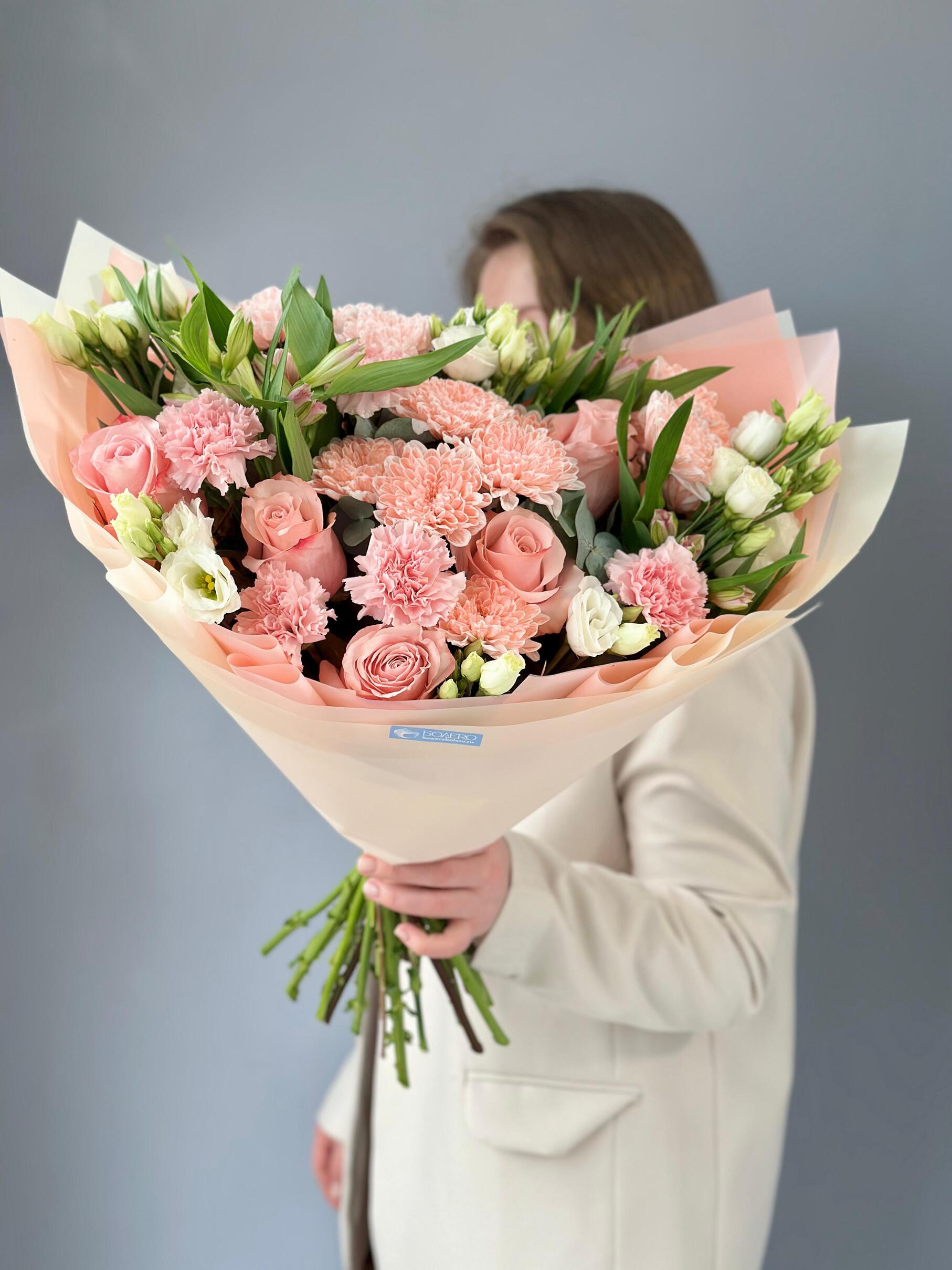 Розы в теплых розовых тонах, гвоздики, кустовые розы и белая эустома собраны в мягкую, женственную композицию с живой зеленью. Букет выглядит объёмным, но остаётся очень деликатным — таким легко сказать спасибо или подарить заботу близкому человеку. Светлая упаковка поддерживает ощущение чистоты и внимания к детали.