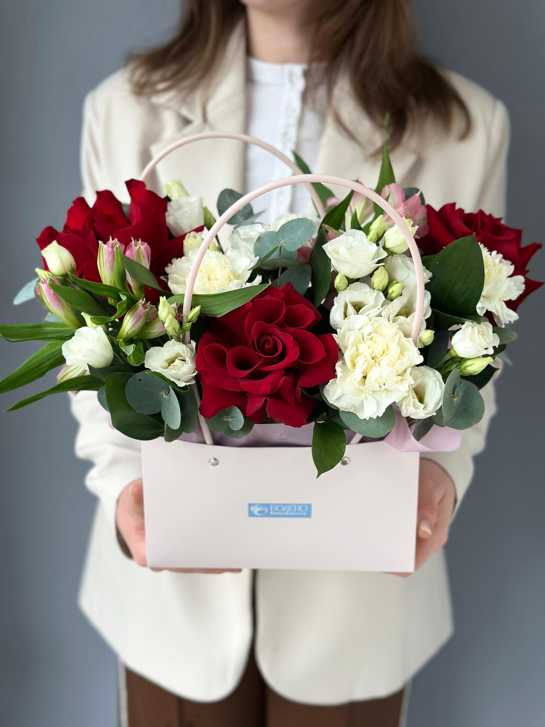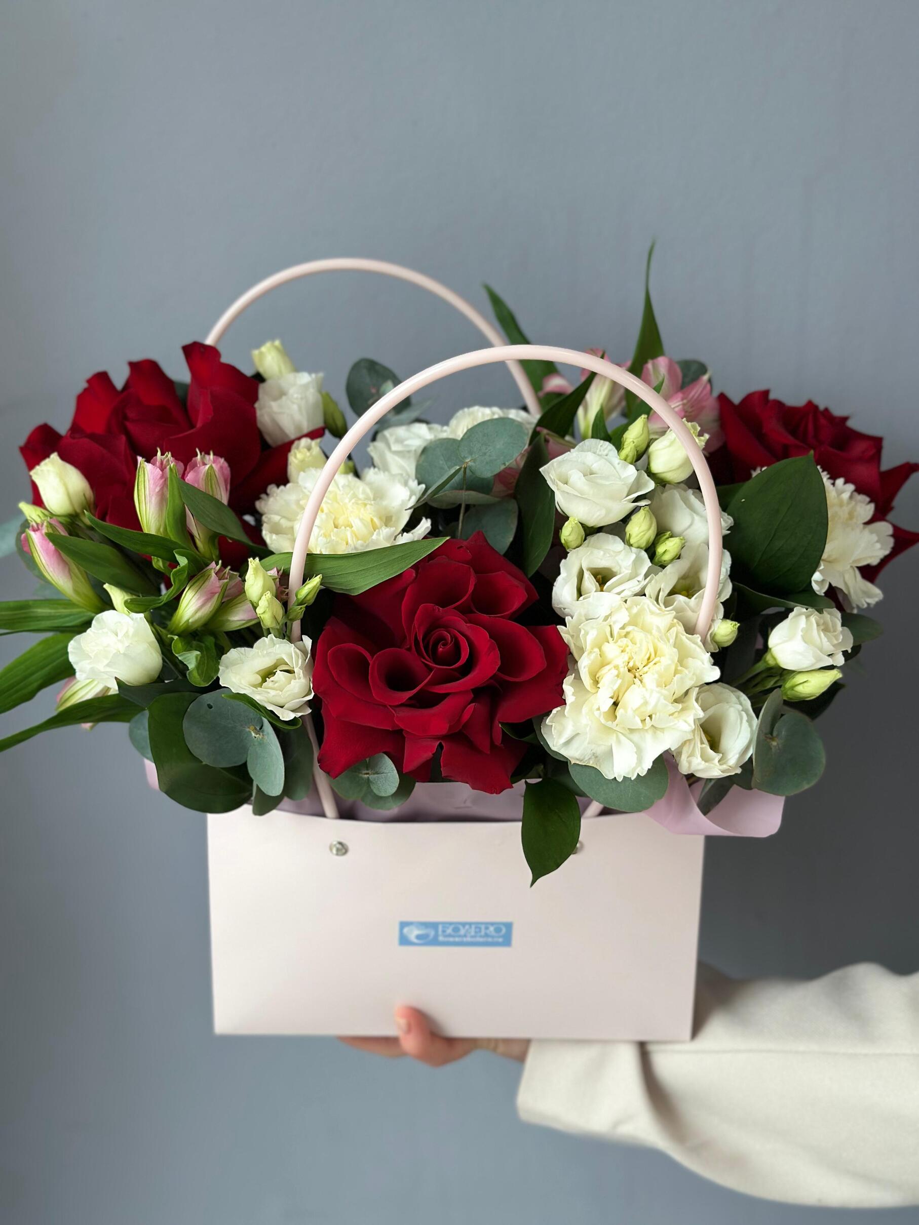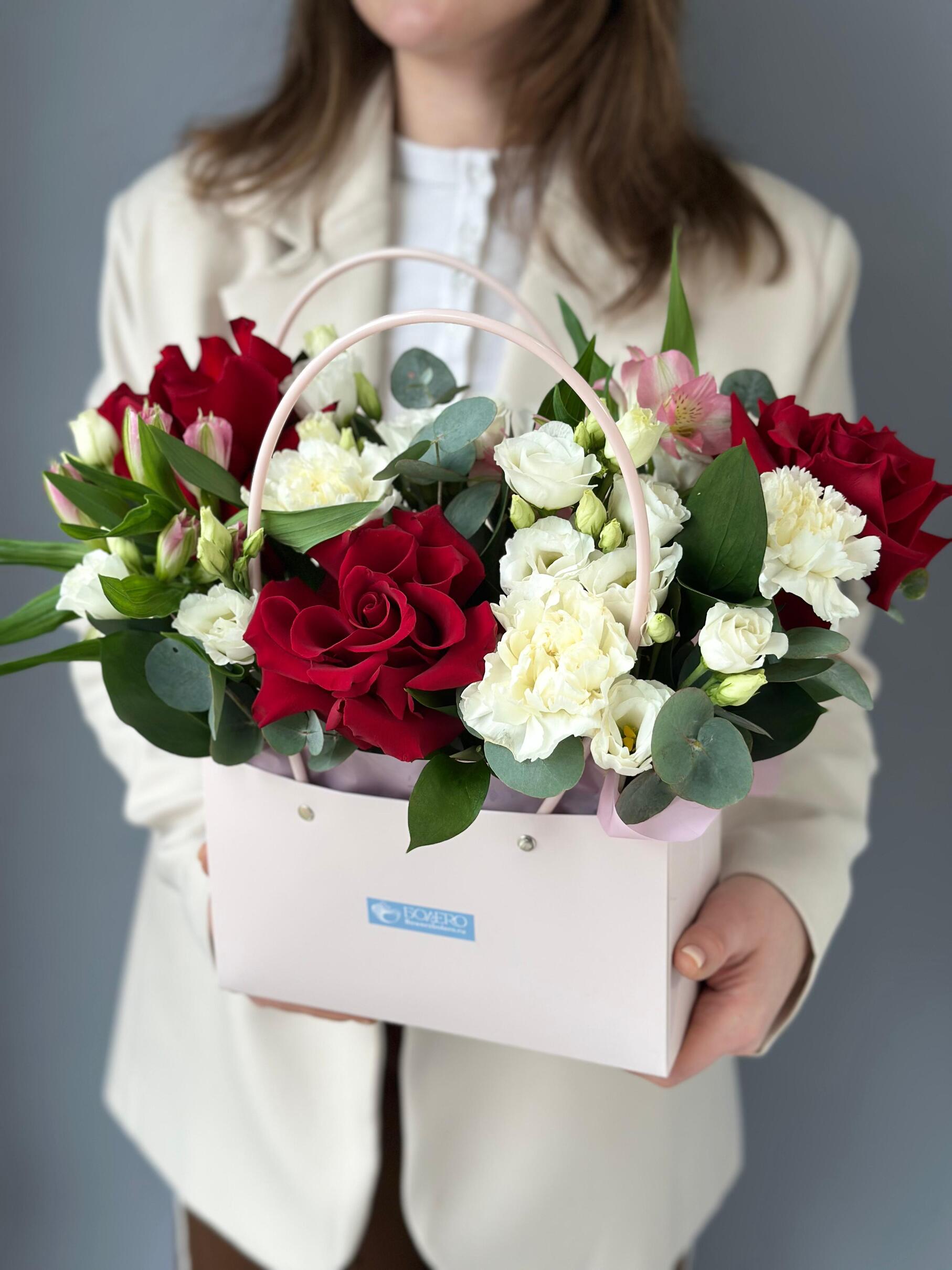 Красные розы собраны вместе с белой эустомой и гвоздикой, к ним добавлены розовые альстромерии и немного эвкалипта — получилась выразительная, но очень аккуратная композиция в нежной коробке. Контраст красного и светлого читается как тёплый личный жест, который можно подарить маме или другому близкому человеку. Удобный формат сумочки делает букет особенно заботливым.