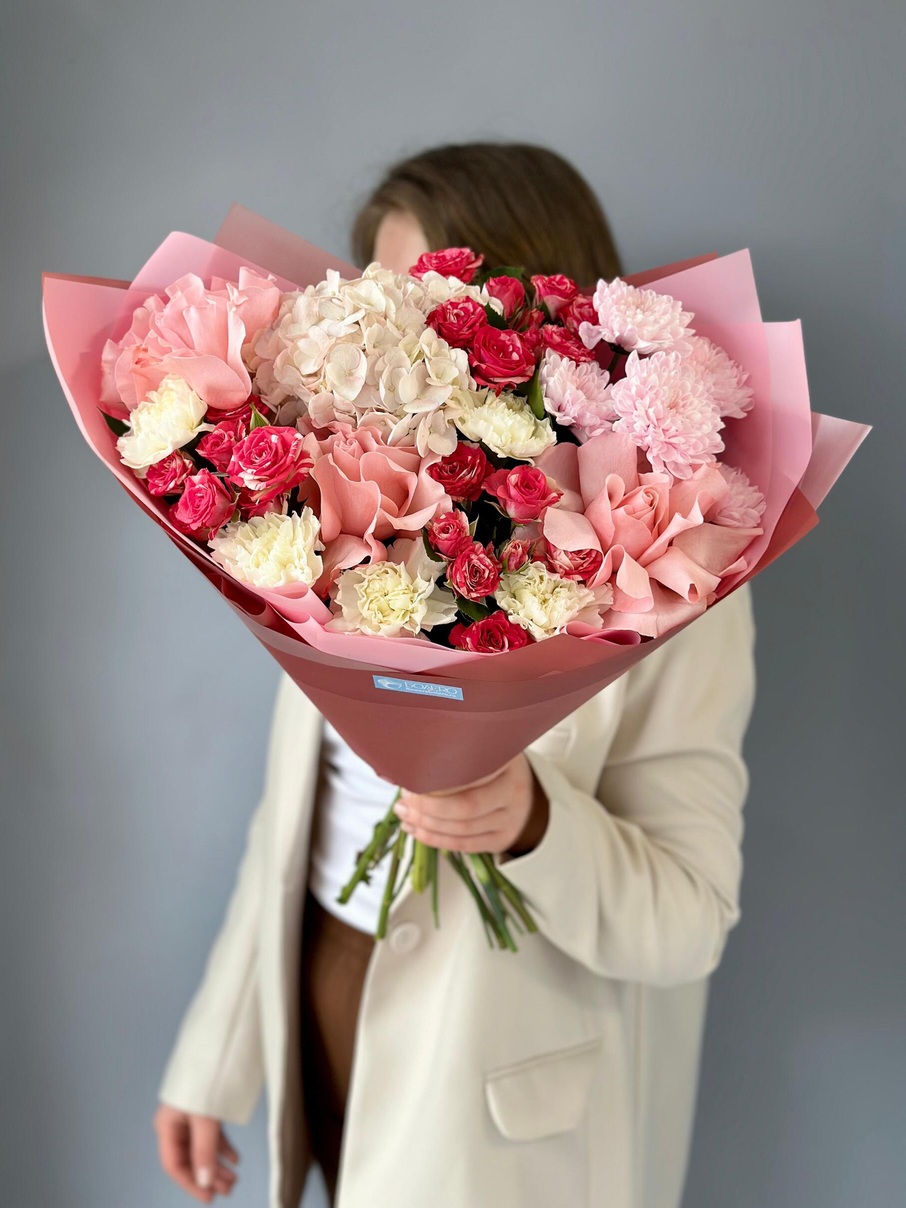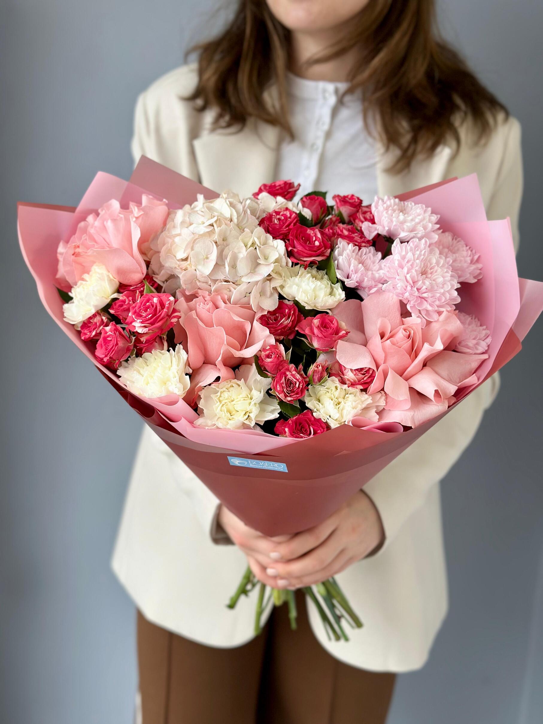 Объёмный букет в розово-кремовой палитре: гортензия, розы, кустовые розы, хризантемы и светлые гвоздики собраны плотно и аккуратно. Контраст тёплых и холодных розовых оттенков делает композицию живой и праздничной, но без лишнего пафоса. Такой букет легко подарить маме или любимому человеку — как знак внимания и тепла.