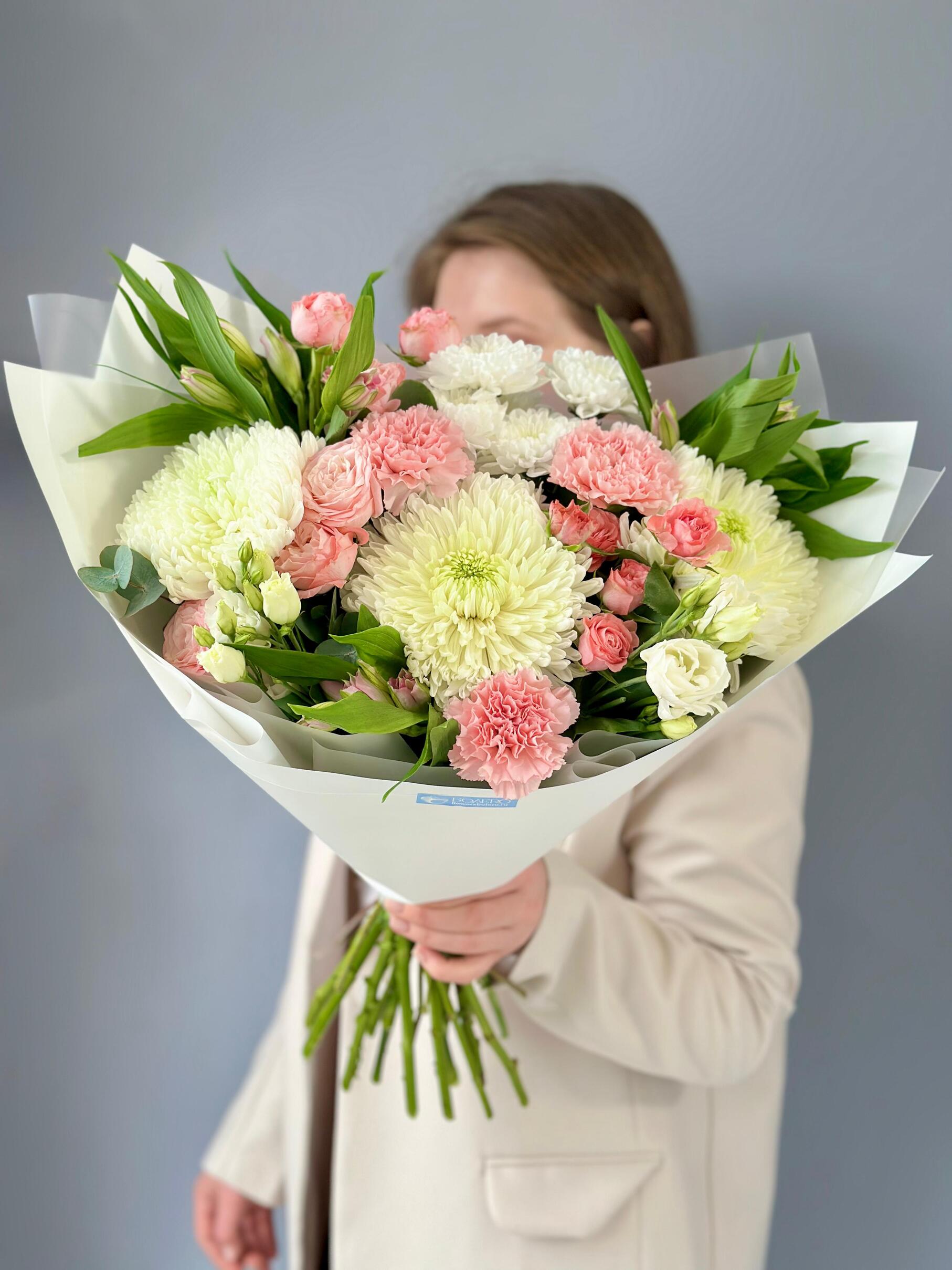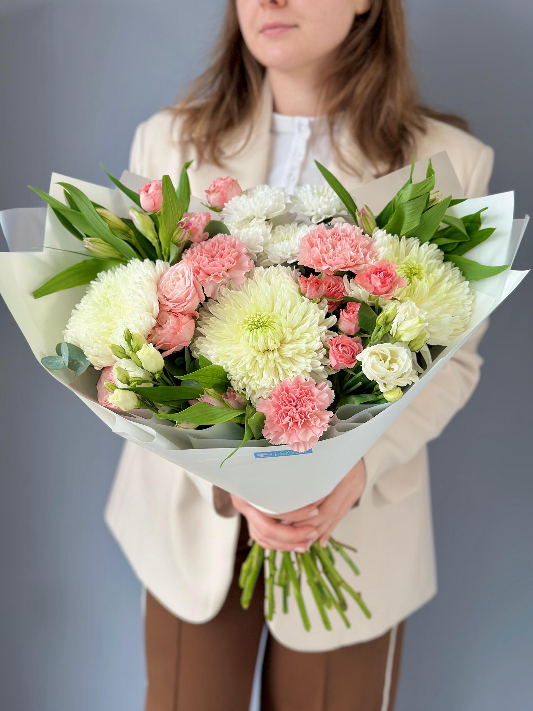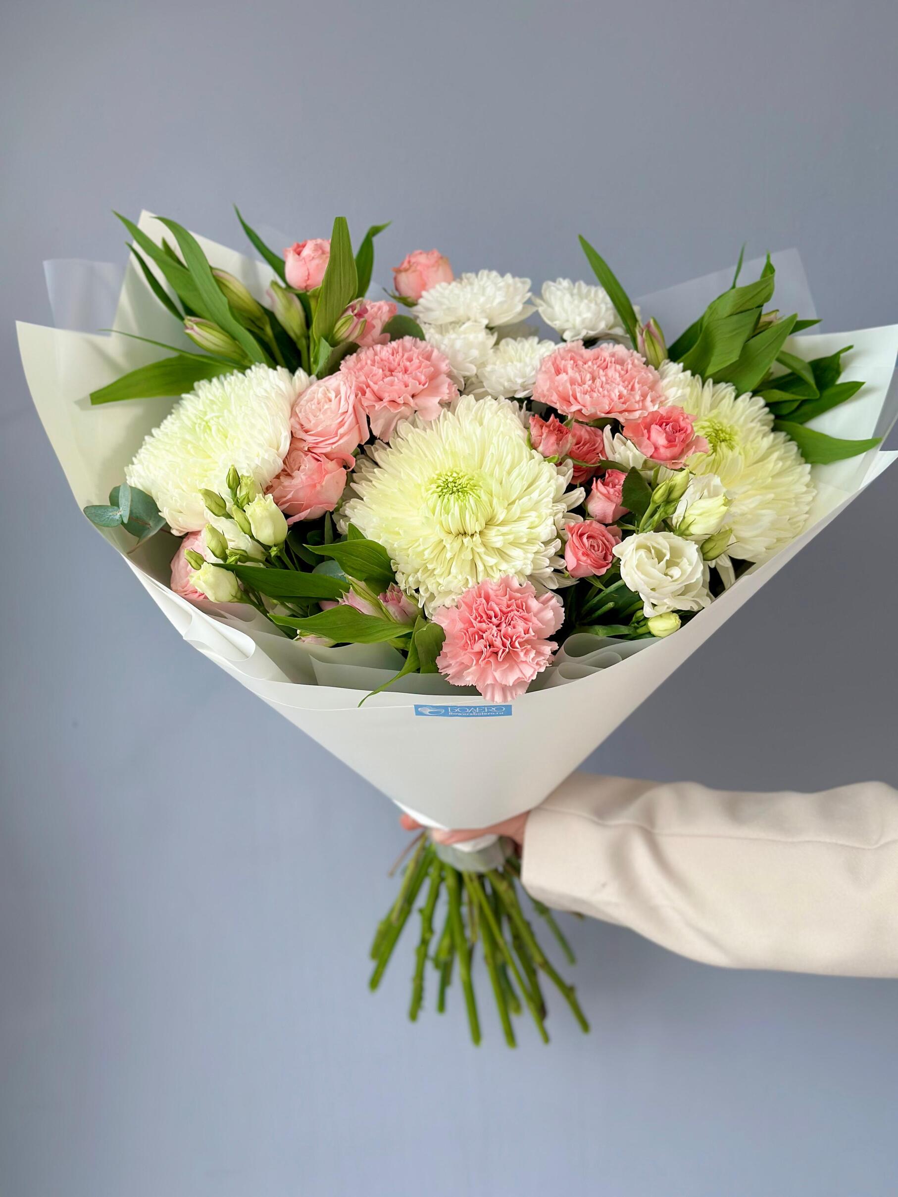 Белые хризантемы, пудровые гвоздики, розовые розы и белая эустома собраны в свежую, живую композицию с зеленью альстромерии. Букет получается очень тёплым и внимательным — таким можно поддержать, поздравить или просто напомнить о себе близкому человеку. Светлая упаковка подчёркивает чистоту палитры.