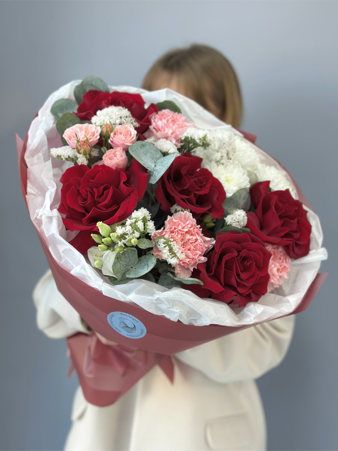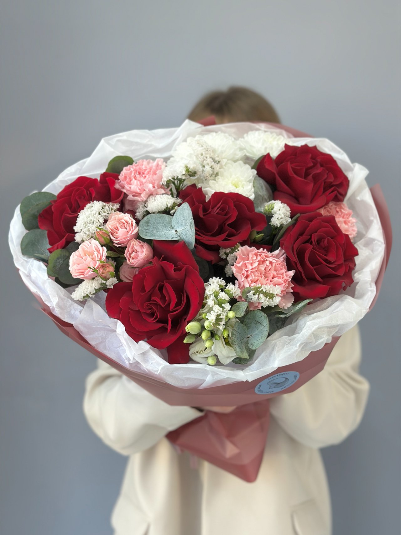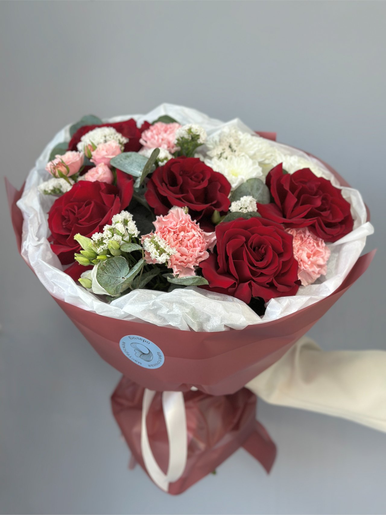 Красные розы, розовые гвоздики, белые хризантемы и лёгкие веточки статицы собраны в букет с мягким контрастом и спокойной глубиной. Эвкалипт добавляет прохладу и равновесие, а плотная форма удерживает внимание без лишней громкости. Это жест, в котором тепло сочетается с точностью.