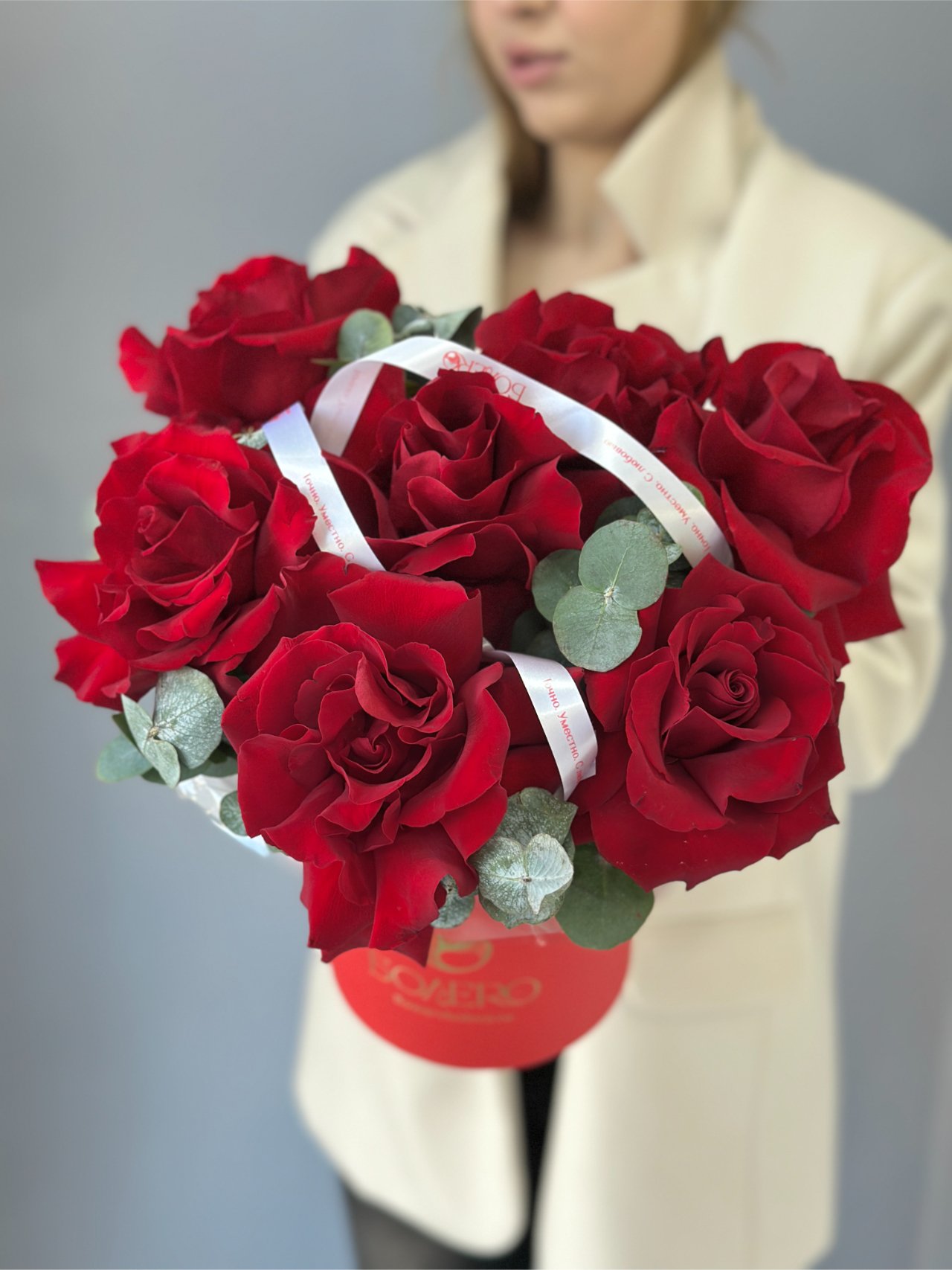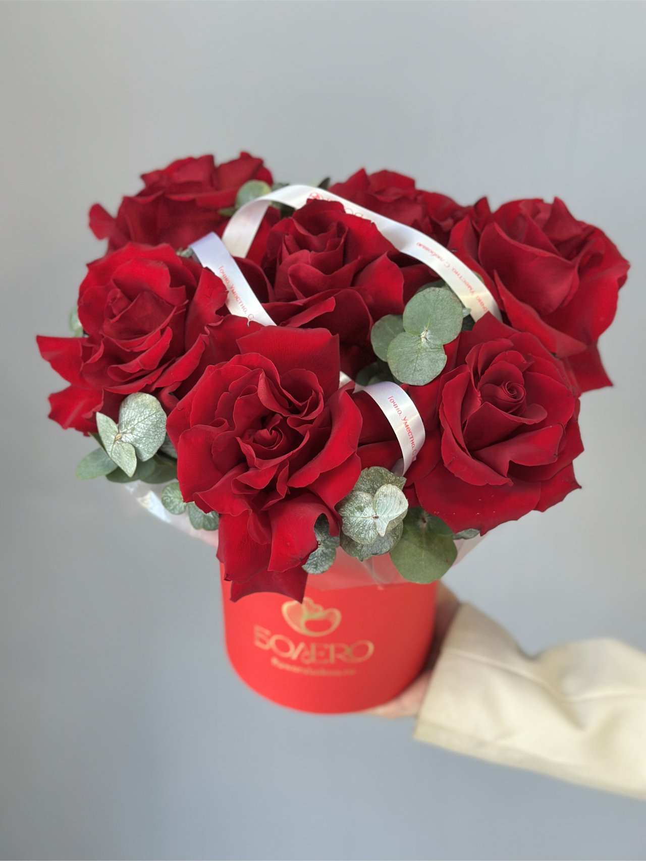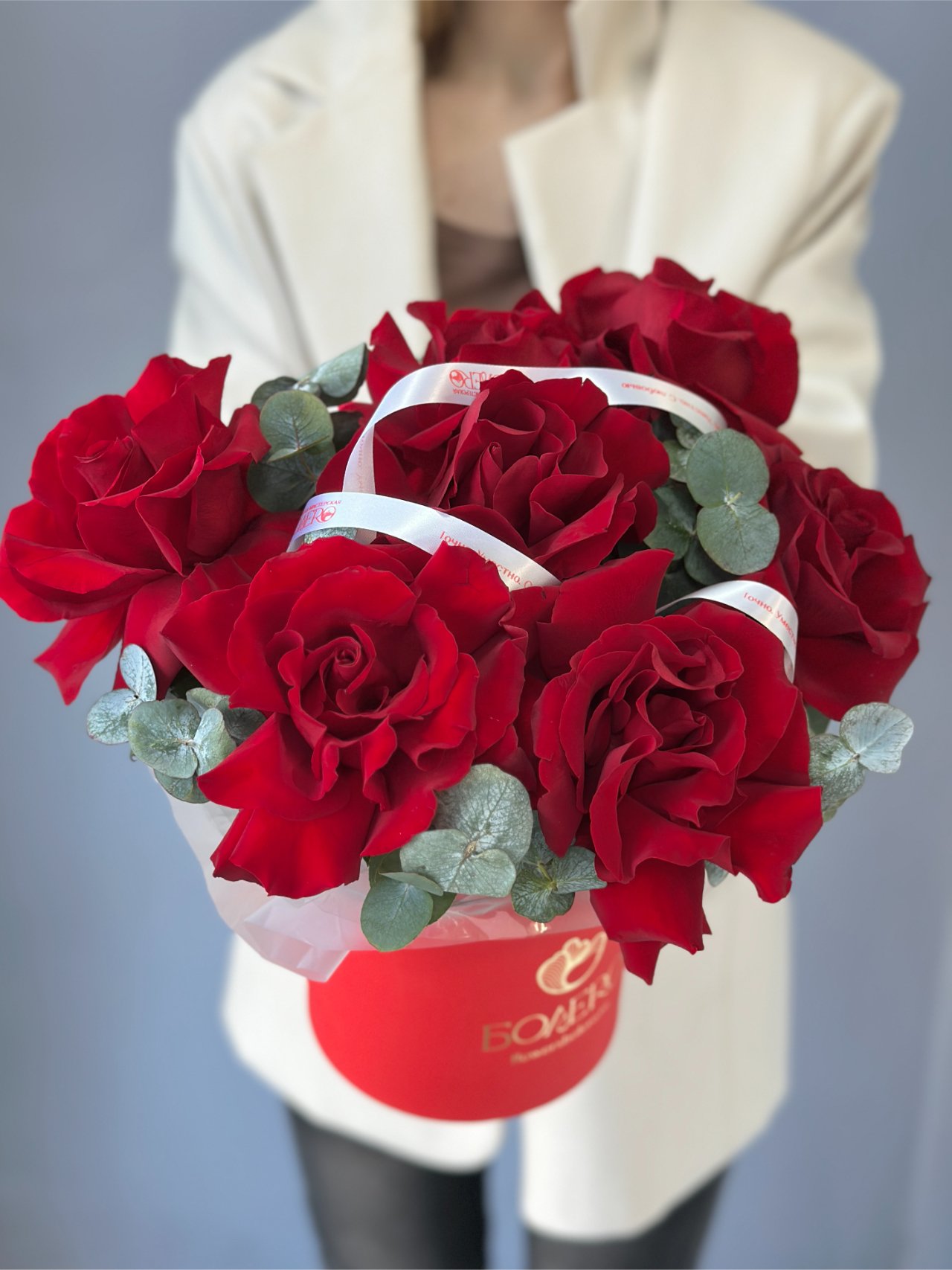 Композиция из насыщенно-красных роз и веточек эвкалипта собрана плотно и чисто, без лишних деталей. Глубокий оттенок лепестков и прохладная зелень создают выразительный контраст и ощущение точного жеста. Это подарок, в котором сила чувства звучит спокойно и уверенно.