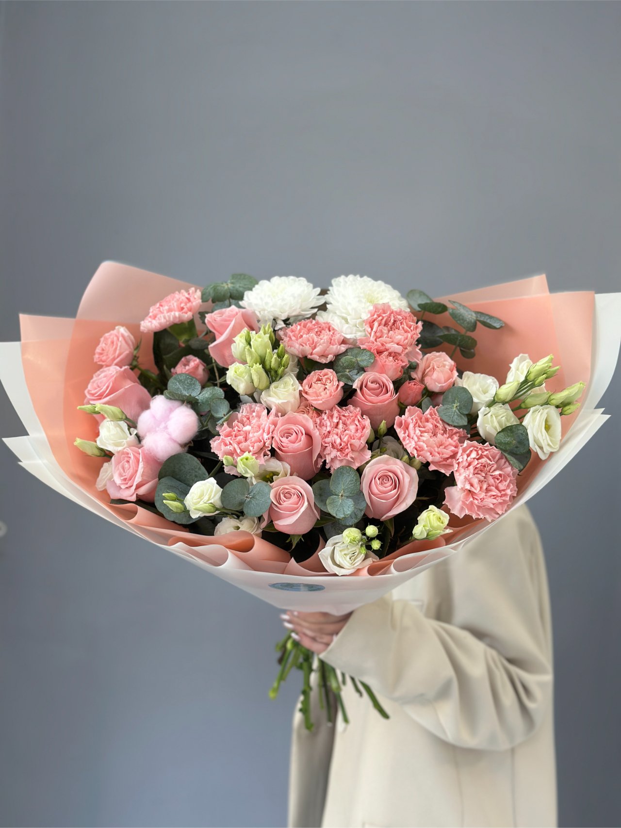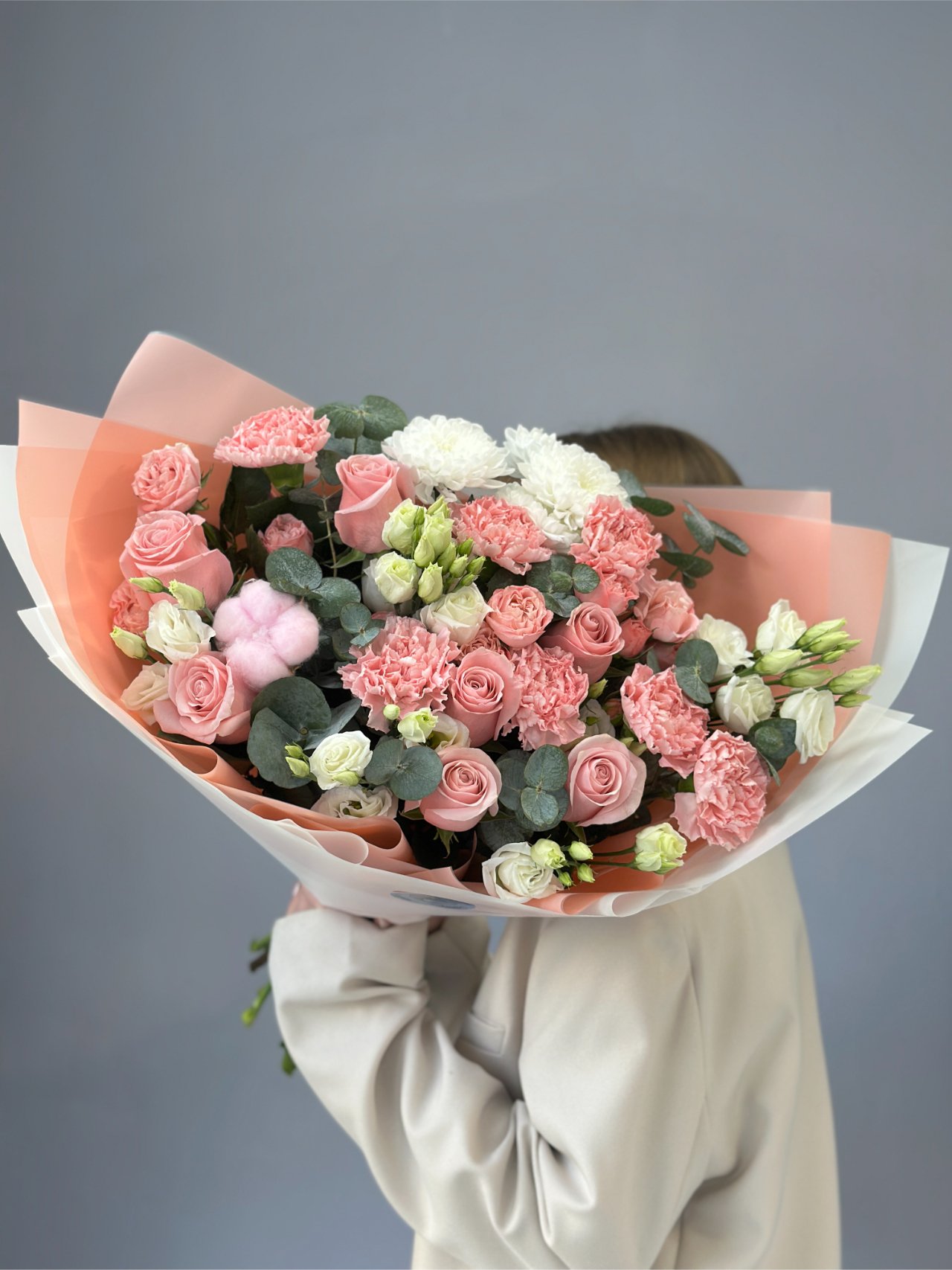 Букет в мягкой розово-кремовой палитре собран из роз, кустовых роз, гвоздик, белой эустомы и эвкалипта с лёгким акцентом хлопка. Спокойная форма и тёплые оттенки создают ощущение внимания, света и внутреннего равновесия. Это тихий жест, в котором есть простота и тепло.